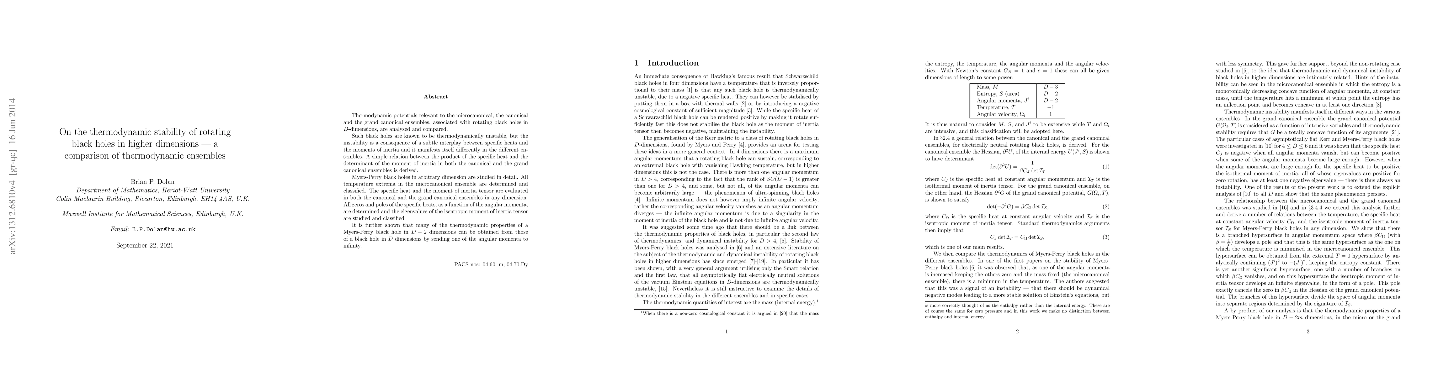 Thermodynamic potentials relevant to the micro-canonical, the canonical and the grand-canonical ensembles, associated with rotating black holes in D-dimensions, are analysed and compared. Such black holes are known to be thermodynamically unstable, but the instability is a consequence of a subtle interplay between specific heats and the moments of inertia and it manifests itself differently in the different ensembles. A simple relation between the product of the specific heat and the determinant of the moment of inertia in both the canonical and the grand-canonical ensembles is derived. Myers-Perry black holes in arbitrary dimension are studied in detail. All temperature extrema in the micro-canonical ensemble are determined and classified. The specific heat and the moment of inertia tensor are evaluated in both the canonical and the grand-canonical ensembles in any dimension. All zeros and poles of the specific heats, as a function of the angular momenta, are determined and the eigenvalues of the isentropic moment of inertia tensor are also found and classified. It is further shown that many of the thermodynamic properties of a Myers-Perry black hole in D-2 dimensions can be obtained from those of a black hole in D dimensions by sending one of the angular momenta to infinity.