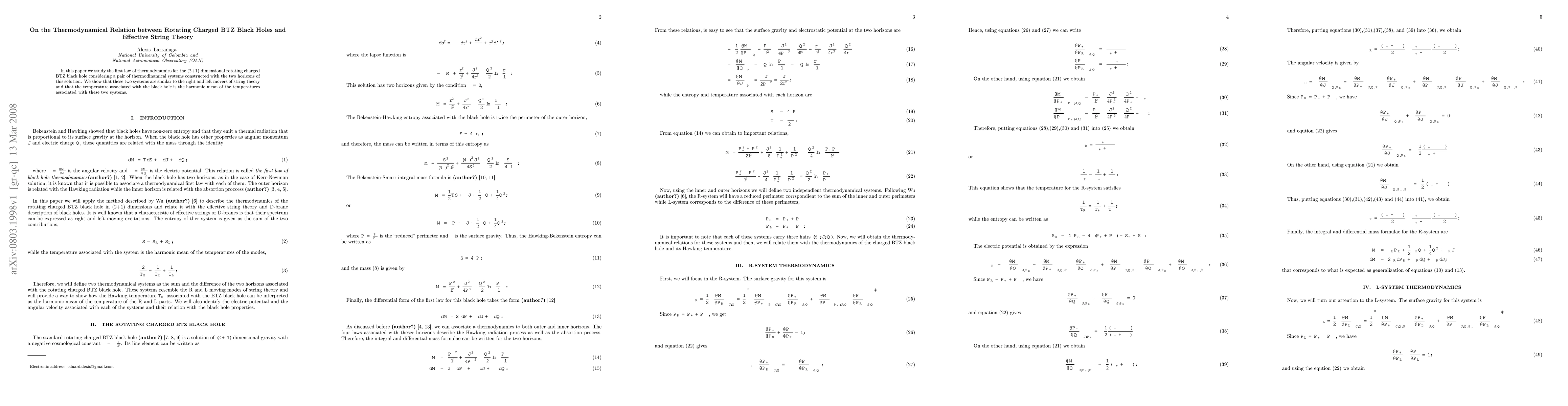 This paper investigates the thermodynamical first law for rotating charged BTZ black holes in (2+1) dimensions, revealing a connection between the two horizons and effective string theory, where the black hole temperature is the harmonic mean of the temperatures of the corresponding string theory systems.