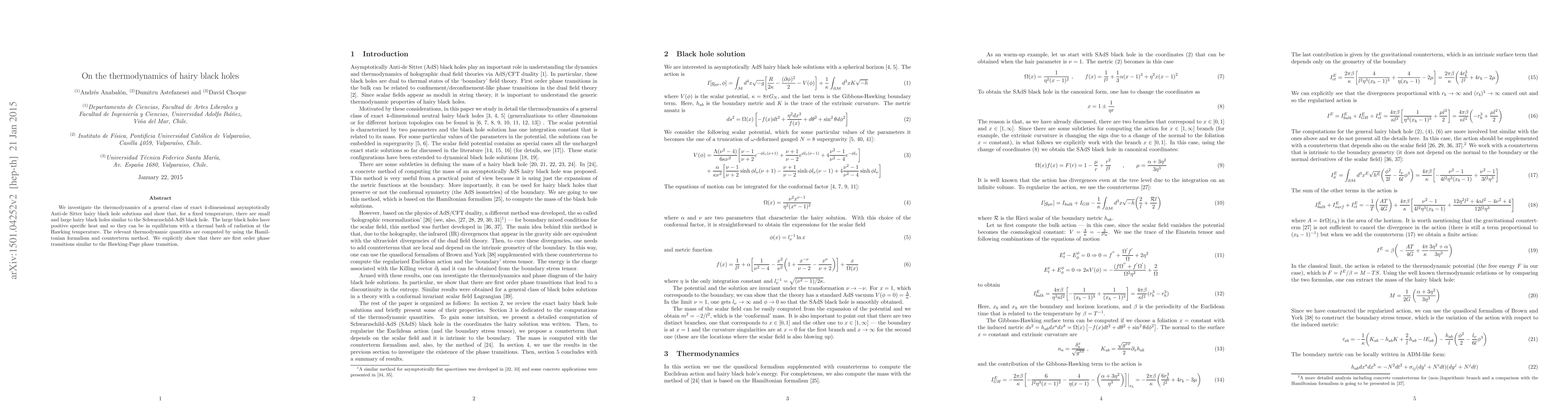 This paper examines the thermodynamics of 4D asymptotically Anti-de Sitter "hairy" black holes, demonstrating the existence of small and large black hole solutions with phase transitions akin to the Hawking-Page transition, using Hamiltonian formalism and counterterm methods. Large black holes exhibit positive specific heat, allowing equilibrium with thermal radiation at Hawking temperature.