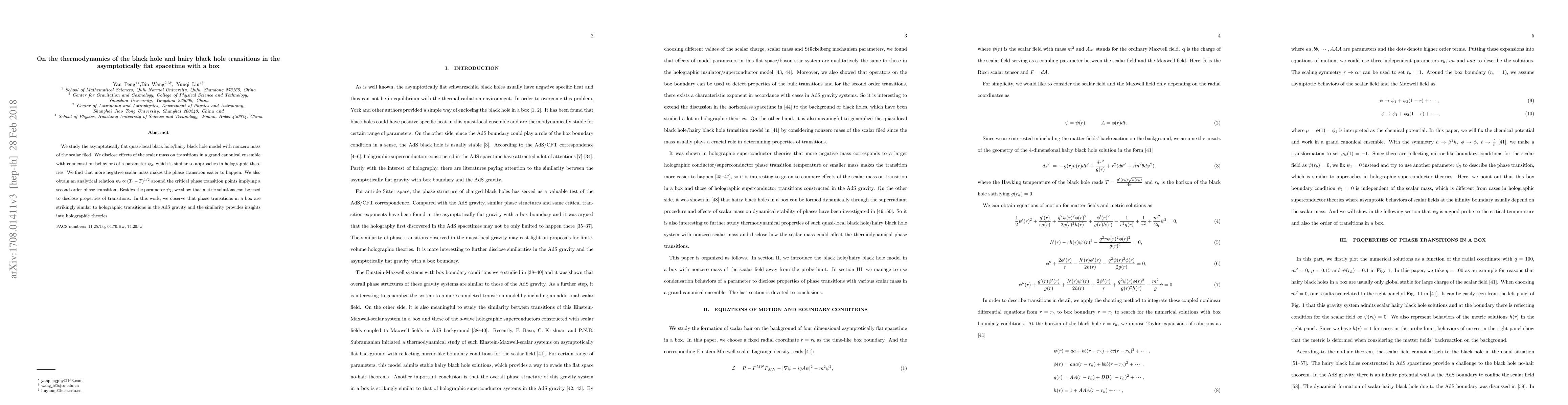 We study the asymptotically flat quasi-local black hole/hairy black hole model with nonzero mass of the scalar filed. We disclose effects of the scalar mass on transitions in a grand canonical ensemble with condensation behaviors of a parameter $\psi_{2}$, which is similar to approaches in holographic theories. We find that more negative scalar mass makes the phase transition easier to happen. We also obtain an analytical relation $\psi_{2}\varpropto(T_{c}-T)^{1/2}$ around the critical phase transition points implying a second order phase transition. Besides the parameter $\psi_{2}$, we show that metric solutions can be used to disclose properties of transitions. In this work, we observe that phase transitions in a box are strikingly similar to holographic transitions in the AdS gravity and the similarity provides insights into holographic theories.
