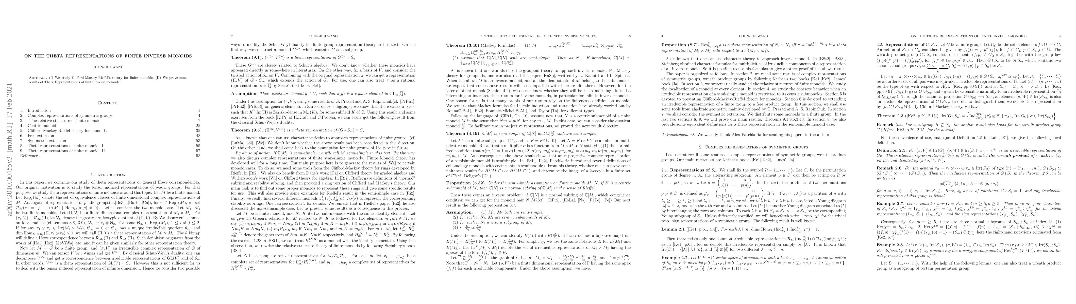 (I) We study Clifford-Mackey-Rieffel's theory for finite monoid; (II) We prove some results of Theta Representations of finite inverse monoids.