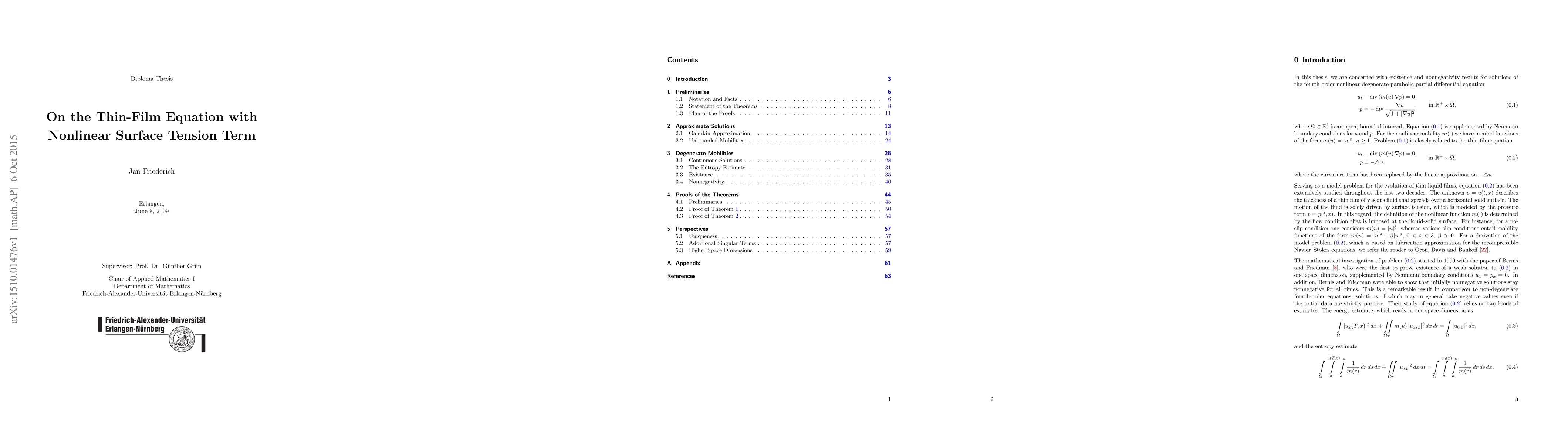 In this thesis, we consider the thin-film equation with nonlinear surface tension term in one space dimension. Relying on the corresponding energy and entropy estimates, we prove existence of weak solutions as well as nonnegativity results.