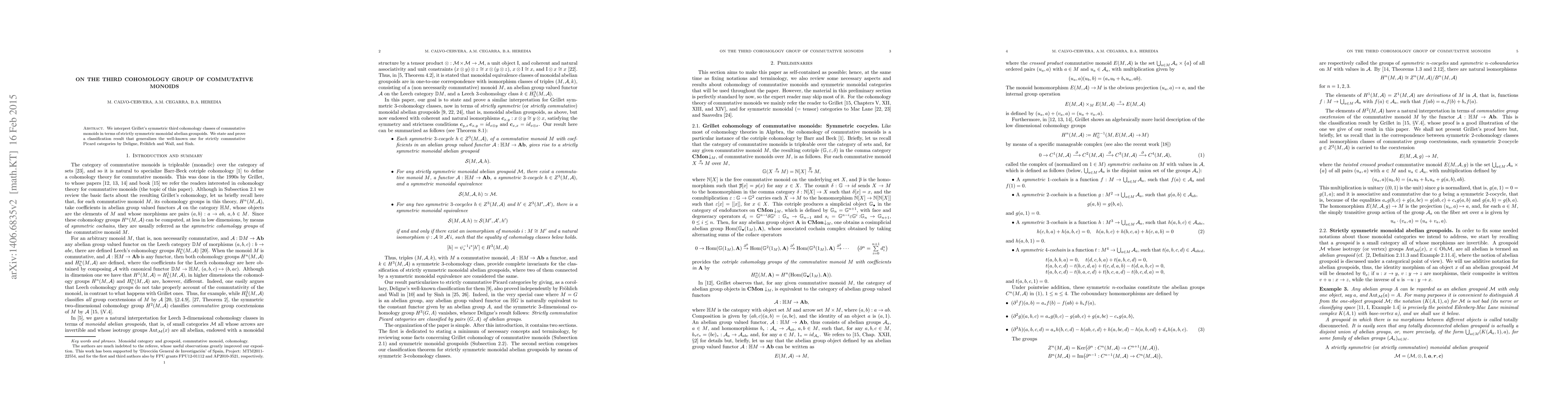 We interpret Grillet's symmetric thrid cohomology classes of commutative monoids in terms of strictly symmetric monoidal abelian groupoids. We state and prove a classification result that generalizes the well-known one for strictly commutative Picard categories by Deligne and Fr\"ohlich and Wall, and Sinh.
