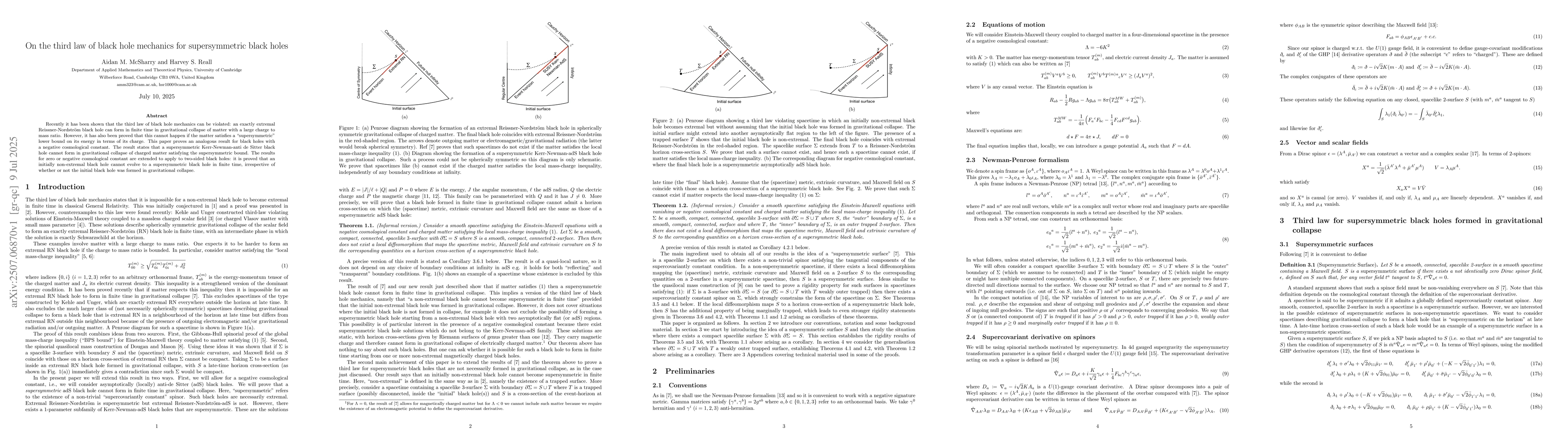 The paper extends the third law of black hole mechanics for supersymmetric black holes, proving that supersymmetric Kerr-Newman-anti de Sitter black holes cannot form from gravitational collapse of charged matter satisfying a supersymmetric lower bound on energy in terms of charge.