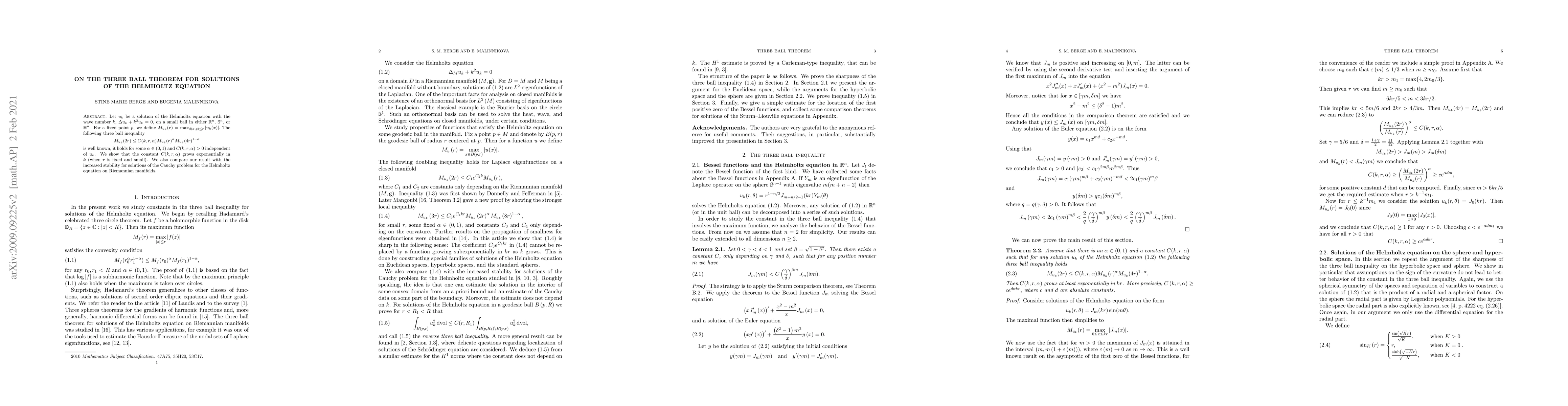 The paper investigates how the constant in a three-ball inequality for solutions of the Helmholtz equation grows exponentially with wave number k, and compares its findings to stability improvements in Cauchy problem solutions on Riemannian manifolds.
