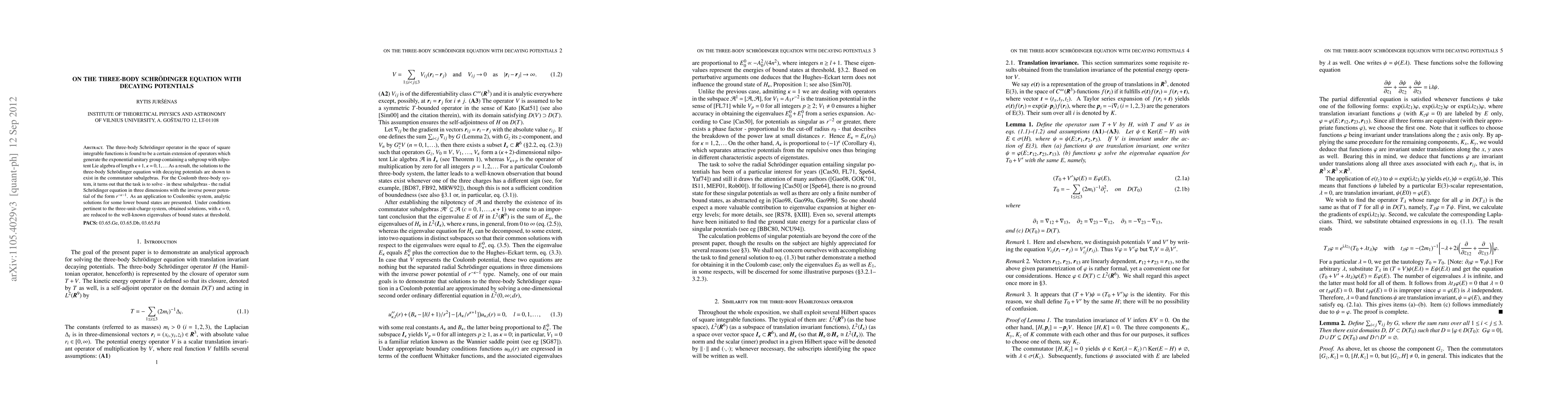 This paper explores the three-body Schrödinger equation with decaying potentials, revealing its relation to operators generating an exponential unitary group. It demonstrates the existence of solutions within commutator subalgebras and presents analytic solutions for lower bound states in the Coulomb three-body system, reducing to known eigenvalues for the three-unit-charge case.