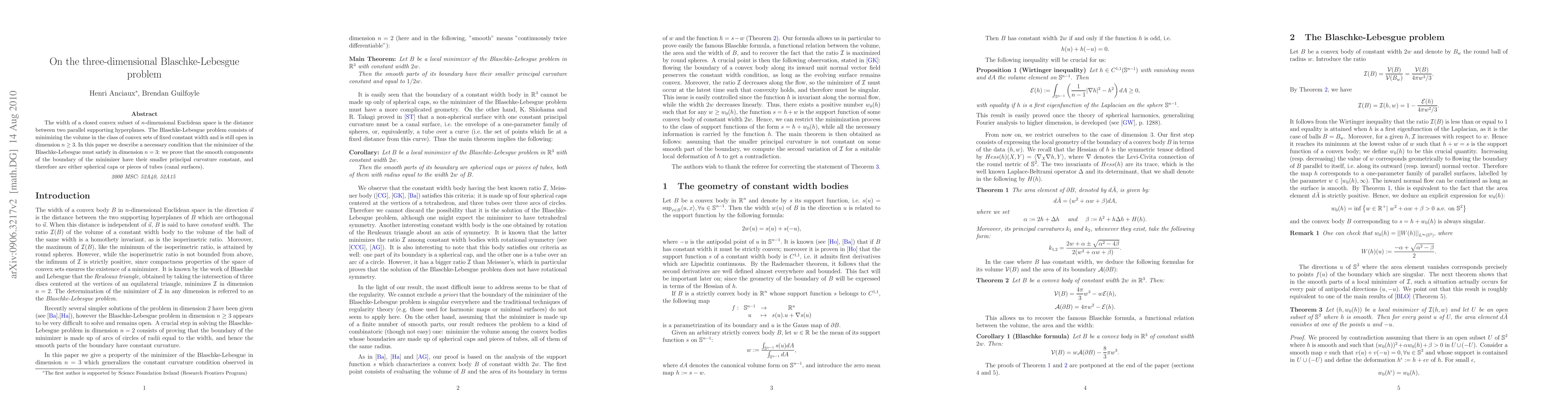 The paper establishes a necessary condition for the minimizer of the Blaschke-Lebesgue problem in three dimensions: smooth boundary components must have constant smaller principal curvature, leading to shapes like spherical caps or canal surfaces. The broader problem of minimizing volume for sets of fixed width remains unsolved for dimensions greater than three.