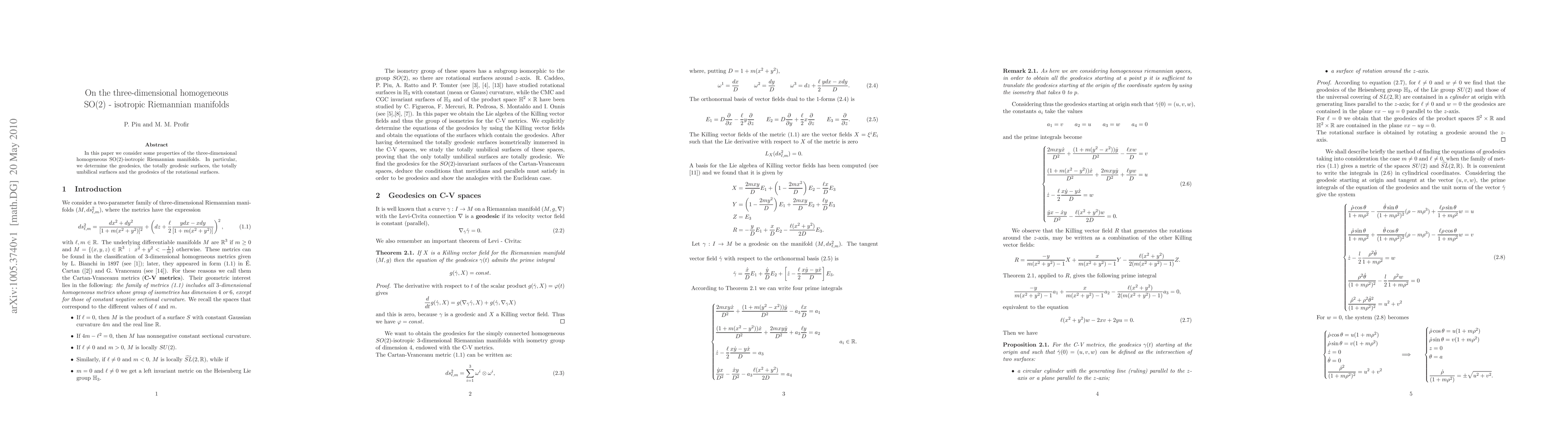 In this paper we consider some properties of the three-dimensional homogeneous SO(2)-isotropic Riemannian manifolds. In particular, we determine the geodesics, the totally geodesic surfaces, the totally umbilical surfaces and the geodesics of the rotational surfaces.