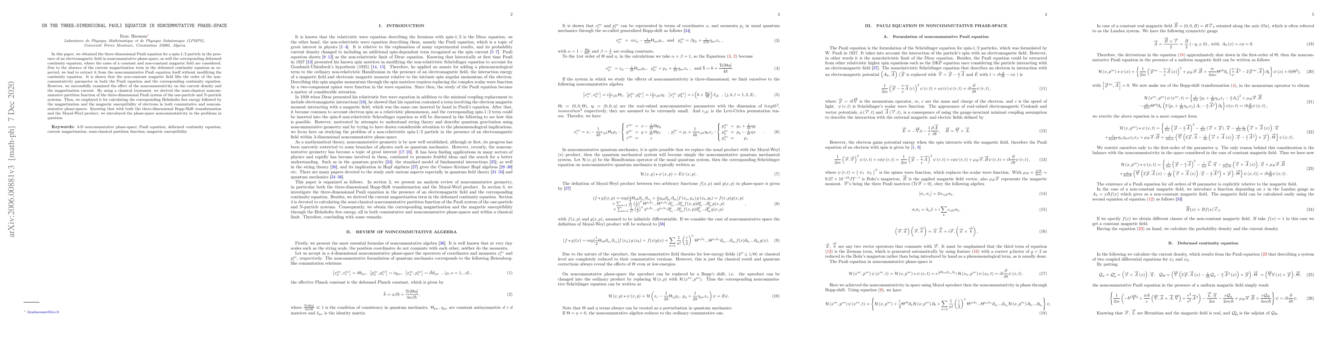 In this paper, we obtained the three-dimensional Pauli equation for a spin-1/2 particle in the presence of an electromagnetic field in noncommutative phase-space, as well the corresponding deformed continuity equation, where the cases of a constant and non-constant magnetic field are considered. Due to the absence of the current magnetization term in the deformed continuity equation as expected, we had to extract it from the noncommutative Pauli equation itself without modifying the continuity equation. It is shown that the non-constant magnetic field lifts the order of the noncommutativity parameter in both the Pauli equation and the corresponding continuity equation. However, we successfully examined the effect of the noncommutativity on the current density and the magnetization current. By using a classical treatment, we derived the semi-classical noncommutative partition function of the three-dimensional Pauli system of the one-particle and N-particle systems. Then, we employed it for calculating the corresponding Helmholtz free energy followed by the magnetization and the magnetic susceptibility of electrons in both commutative and noncommutative phase-spaces. Knowing that with both the three-dimensional Bopp-Shift transformation and the Moyal-Weyl product, we introduced the phase-space noncommutativity in the problems in question.
