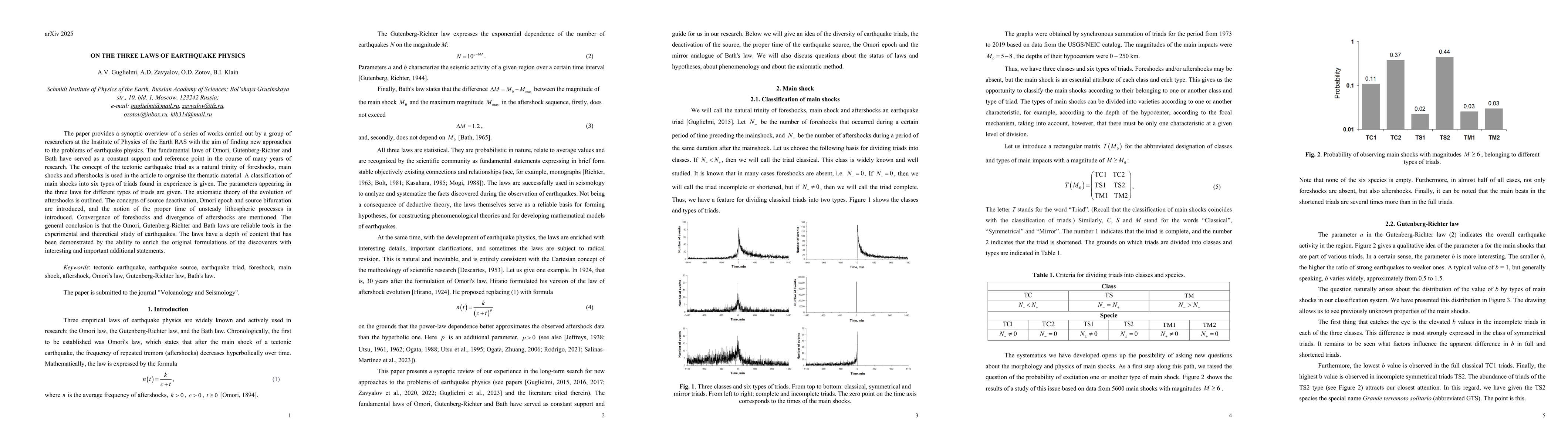 The paper provides a synoptic overview of a series of works carried out by a group of researchers at the Institute of Physics of the Earth RAS with the aim of finding new approaches to the problems of earthquake physics. The fundamental laws of Omori, Gutenberg-Richter and Bath have served as a constant support and reference point in the course of many years of research. The concept of the tectonic earthquake triad as a natural trinity of foreshocks, main shocks and aftershocks is used in the article to organise the thematic material. A classification of main shocks into six types of triads found in experience is given. The parameters appearing in the three laws for different types of triads are given. The axiomatic theory of the evolution of aftershocks is outlined. The concepts of source deactivation, Omori epoch and source bifurcation are introduced, and the notion of the proper time of unsteady lithospheric processes is introduced. Convergence of foreshocks and divergence of aftershocks are mentioned. The general conclusion is that the Omori, Gutenberg-Richter and Bath laws are reliable tools in the experimental and theoretical study of earthquakes. The laws have a depth of content that has been demonstrated by the ability to enrich the original formulations of the discoverers with interesting and important additional statements.