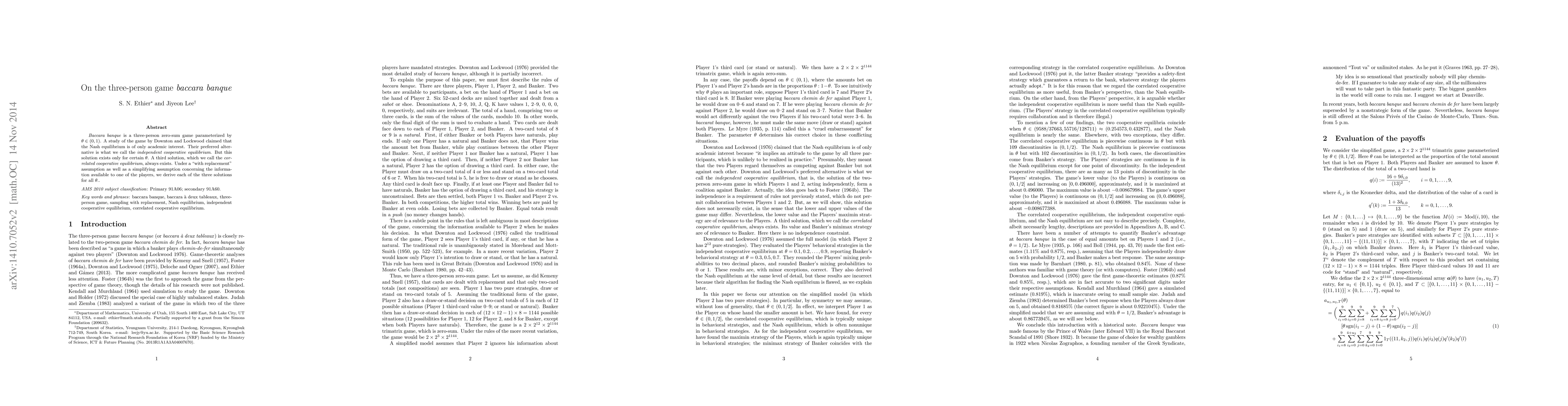Baccara banque is a three-person zero-sum game parameterized by $\theta\in(0,1)$. A study of the game by Downton and Lockwood claimed that the Nash equilibrium is of only academic interest. Their preferred alternative is what we call the independent cooperative equilibrium. But this solution exists only for certain $\theta$. A third solution, which we call the correlated cooperative equilibrium, always exists. Under a "with replacement" assumption as well as a simplifying assumption concerning the information available to one of the players, we derive each of the three solutions for all $\theta$.