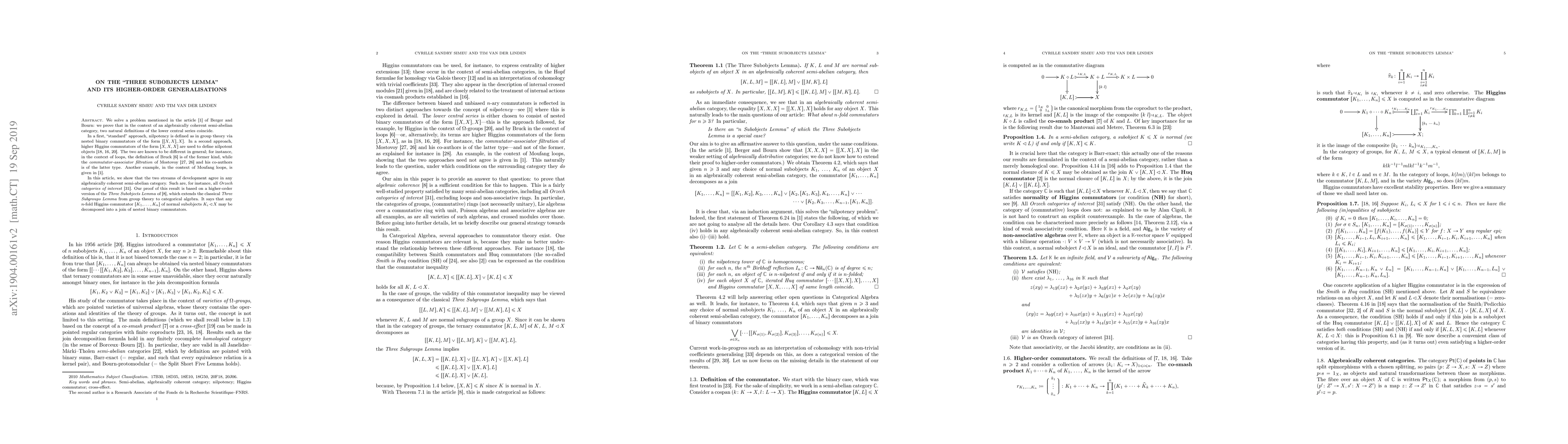 We solve a problem mentioned in an article of Berger and Bourn: we prove that in the context of an algebraically coherent semi-abelian category, two natural definitions of the lower central series coincide. In a first, "standard" approach, nilpotency is defined as in group theory via nested binary commutators of the form $[[X,X],X]$. In a second approach, higher Higgins commutators of the form $[X,X,X]$ are used to define nilpotent objects. The two are known to be different in general; for instance, in the context of loops, the definition of Bruck is of the former kind, while the commutator-associator filtration of Mostovoy and his co-authors is of the latter type. Another example, in the context of Moufang loops, is given in Berger and Bourn's paper. In this article, we show that the two streams of development agree in any algebraically coherent semi-abelian category. Such are, for instance, all Orzech categories of interest. Our proof of this result is based on a higher-order version of the Three Subobjects Lemma of Cigoli-Gray-Van der Linden, which extends the classical Three Subgroups Lemma from group theory to categorical algebra. It says that any $n$-fold Higgins commutator $[K_1, \dots,K_n]$ of normal subobjects $K_i$ of an object $X$ may be decomposed into a join of nested binary commutators.