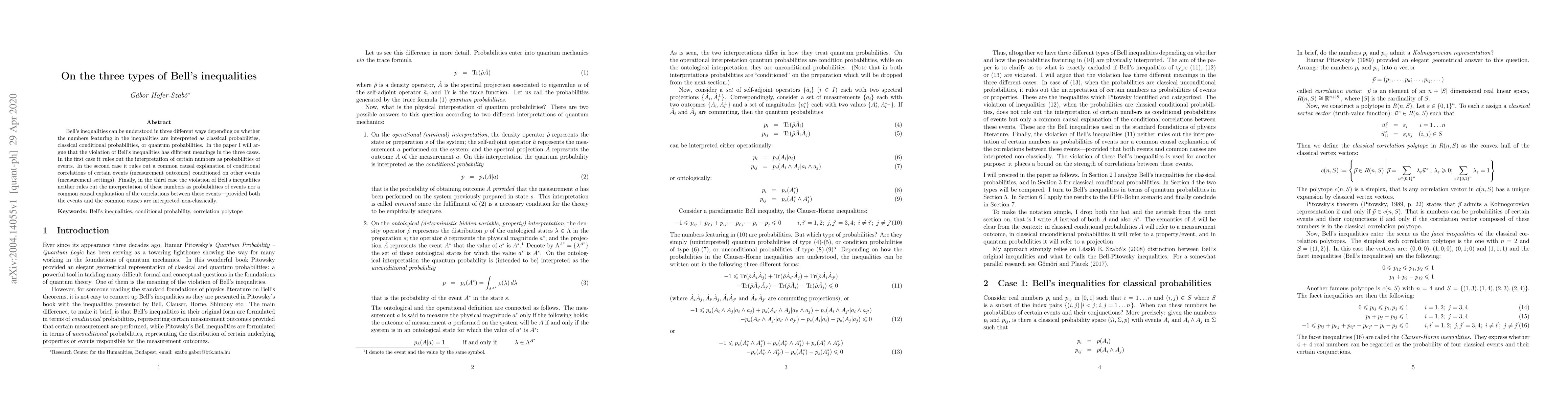 The paper analyzes Bell's inequalities from three perspectives: classical probabilities, classical conditional probabilities, and quantum probabilities.