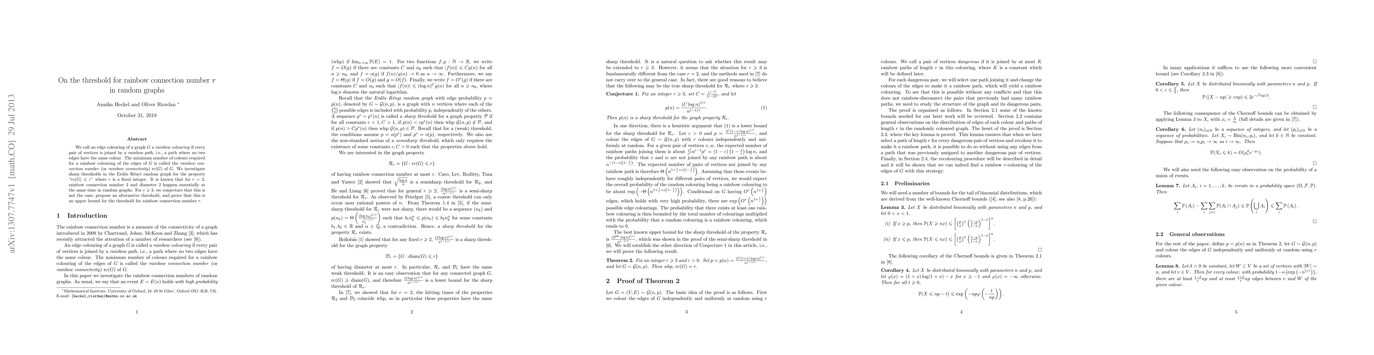 Researchers investigate thresholds for rainbow connection number r in random graphs, proposing an alternative threshold for r >= 3 and proving it as an upper bound, while finding that for r = 2, rainbow connection number 2 and diameter 2 happen essentially at the same time.