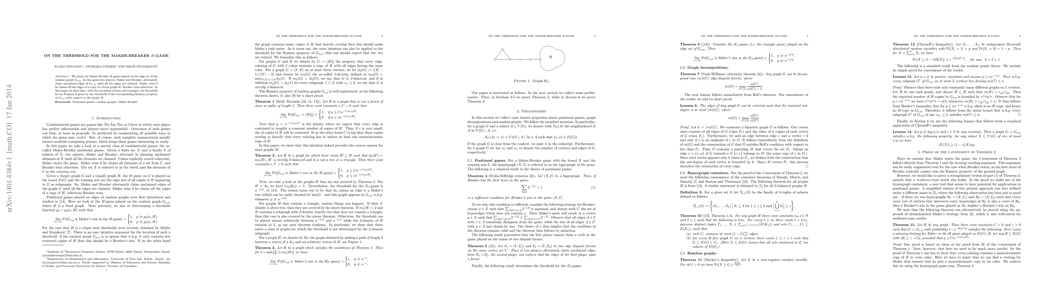 We study the Maker-Breaker $H$-game played on the edge set of the random graph $G_{n,p}$. In this game two players, Maker and Breaker, alternately claim unclaimed edges of $G_{n,p}$, until all the edges are claimed. Maker wins if he claims all the edges of a copy of a fixed graph $H$; Breaker wins otherwise. In this paper we show that, with the exception of trees and triangles, the threshold for an $H$-game is given by the threshold of the corresponding Ramsey property of $G_{n,p}$ with respect to the graph $H$.