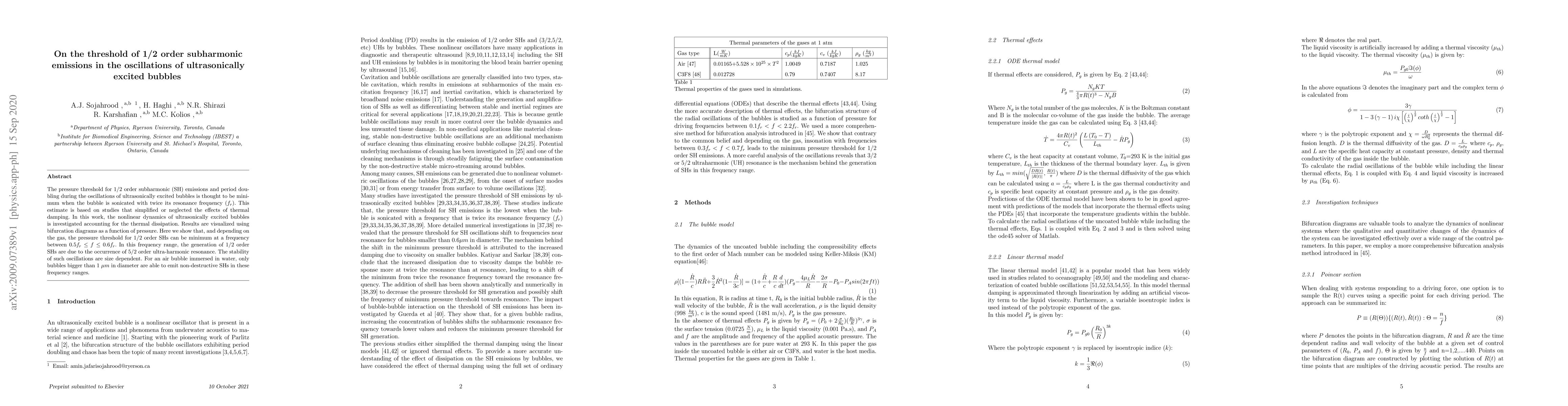 The pressure threshold for 1/2 order subharmonic (SH) emissions and period