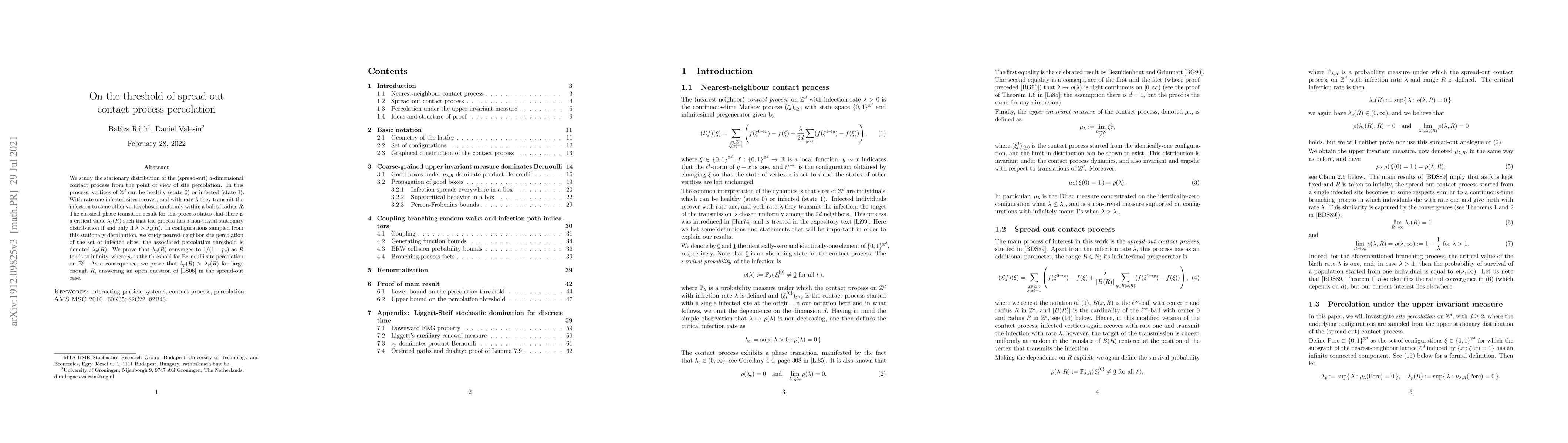 The paper studies a contact process in d-dimensional space, proving that as the radius of transmission increases, the percolation threshold for infected sites exceeds the critical value for the entire system.