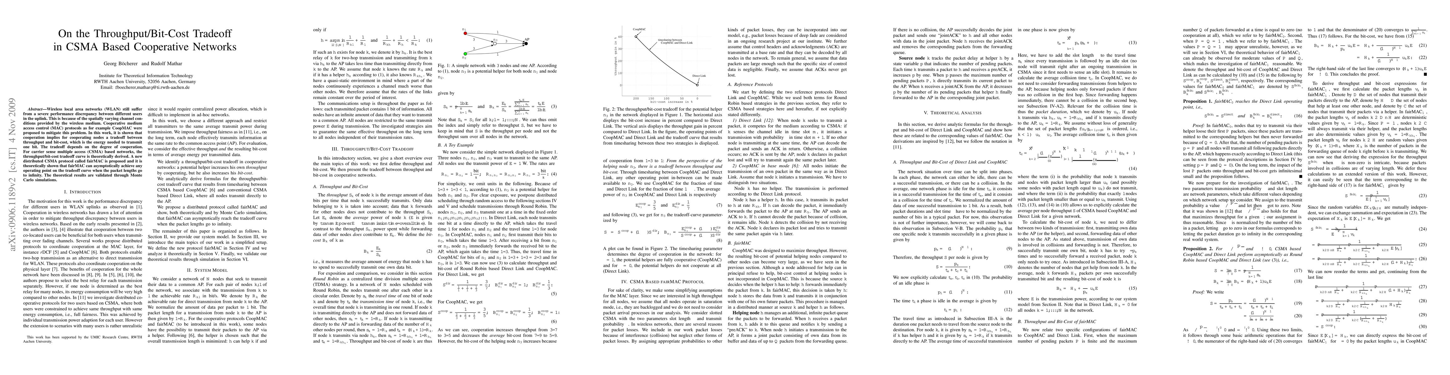 This paper explores the throughput/bit-cost tradeoff in CSMA-based cooperative networks, demonstrating that cooperation among nodes leads to a dependency on the degree of cooperation. A new protocol, fairMAC, is proposed to achieve any point on the tradeoff curve asymptotically, validated by Monte Carlo simulations.