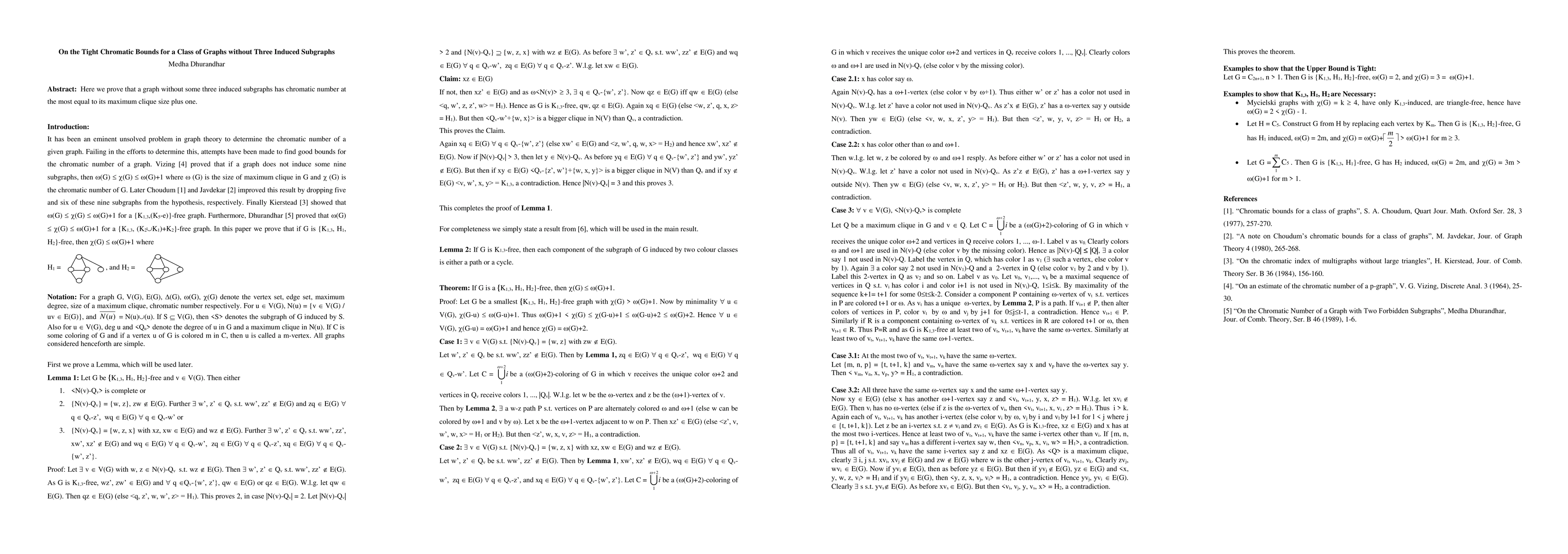 Summary: This paper establishes that graphs without specific three induced subgraphs have a chromatic number no greater than their maximum clique size plus one. It also demonstrates that these bounds are tight, providing examples to illustrate the necessity of each forbidden subgraph.