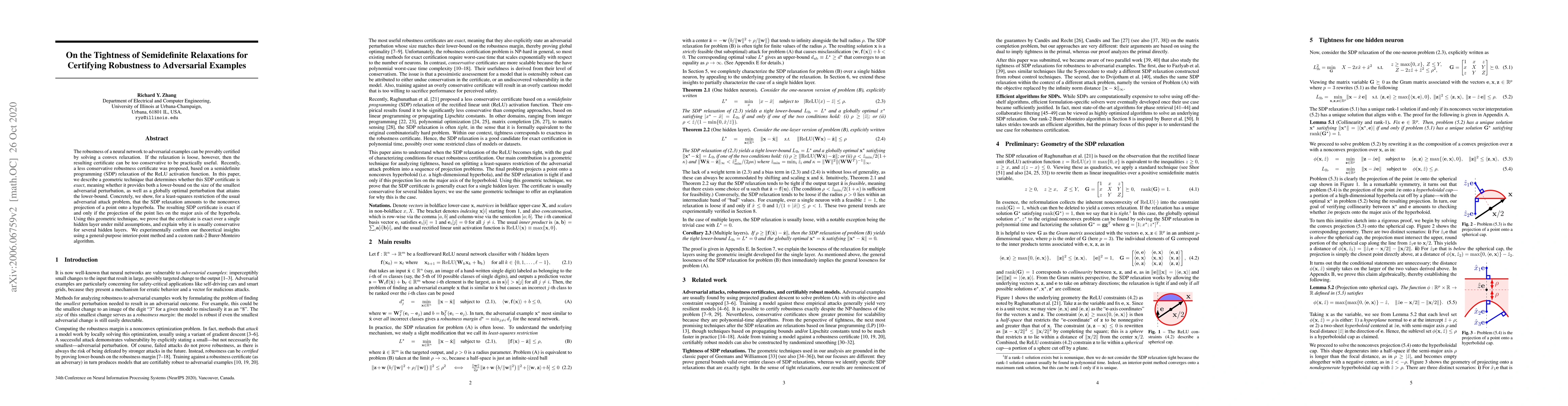 The robustness of a neural network to adversarial examples can be provably certified by solving a convex relaxation. If the relaxation is loose, however, then the resulting certificate can be too conservative to be practically useful. Recently, a less conservative robustness certificate was proposed, based on a semidefinite programming (SDP) relaxation of the ReLU activation function. In this paper, we describe a geometric technique that determines whether this SDP certificate is exact, meaning whether it provides both a lower-bound on the size of the smallest adversarial perturbation, as well as a globally optimal perturbation that attains the lower-bound. Concretely, we show, for a least-squares restriction of the usual adversarial attack problem, that the SDP relaxation amounts to the nonconvex projection of a point onto a hyperbola. The resulting SDP certificate is exact if and only if the projection of the point lies on the major axis of the hyperbola. Using this geometric technique, we prove that the certificate is exact over a single hidden layer under mild assumptions, and explain why it is usually conservative for several hidden layers. We experimentally confirm our theoretical insights using a general-purpose interior-point method and a custom rank-2 Burer-Monteiro algorithm.