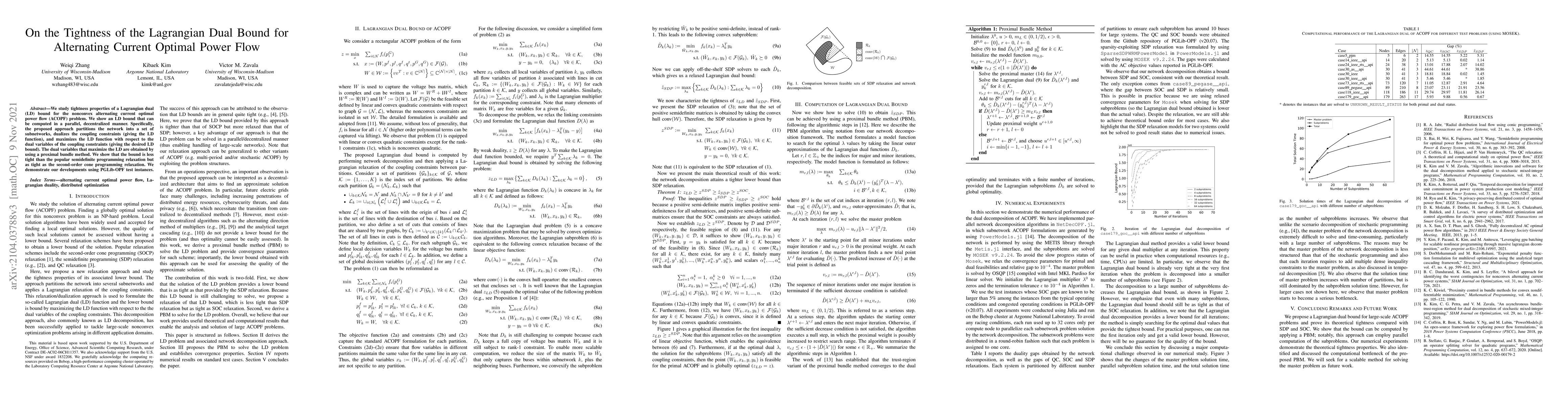This paper investigates the tightness of a Lagrangian dual (LD) bound for the nonconvex alternating current optimal power flow (ACOPF) problem, proposing a parallel, decentralized method to compute the LD bound. The method partitions the network, dualizes coupling constraints, and maximizes the LD function using a proximal bundle method, showing it is as tight as the second-order cone programming relaxation but less so than the semidefinite programming relaxation.