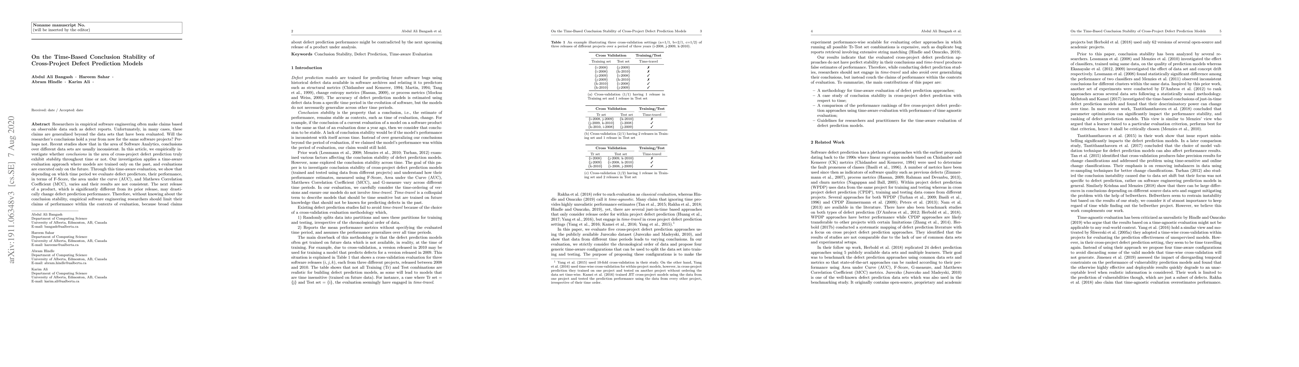 This paper investigates the time-based stability of cross-project defect prediction models, finding that their performance metrics vary significantly over time, indicating that conclusions drawn from current data may not hold for future releases. Researchers are advised to limit broad claims about defect prediction performance due to potential drastic changes in model performance with new product releases.