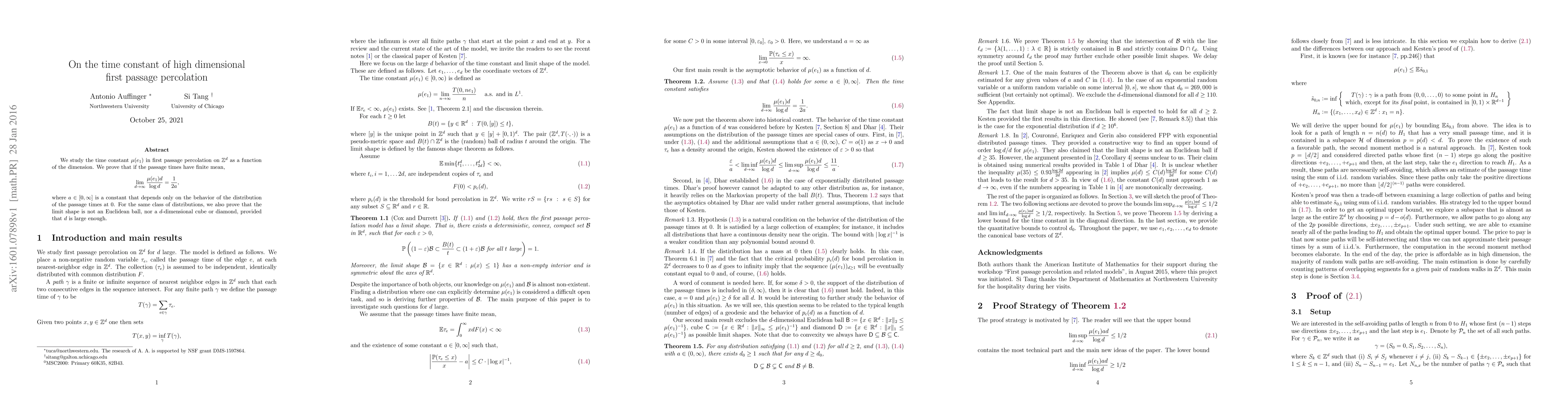 This paper investigates the time constant $\mu(e_{1})$ in high-dimensional first passage percolation, proving that as the dimension $d$ approaches infinity, $\mu(e_{1}) d/\log d$ converges to $1/(2a)$, where $a$ is a constant dependent on the passage times' distribution behavior near zero. It also shows that the limit shape deviates from Euclidean balls, cubes, or diamonds for sufficiently large dimensions.