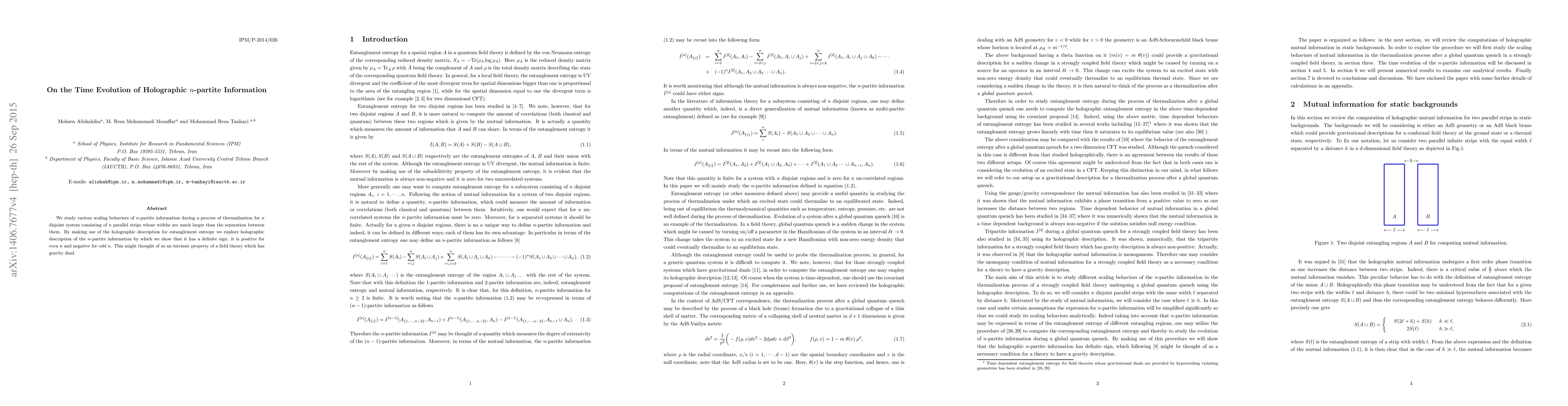 This paper investigates the time evolution of n-partite information in thermalizing n disjoint quantum systems post-quench, using a holographic description. It reveals that n-partite information has a definite sign: positive for even n and negative for odd n, suggesting an intrinsic property of field theories with gravity duals.