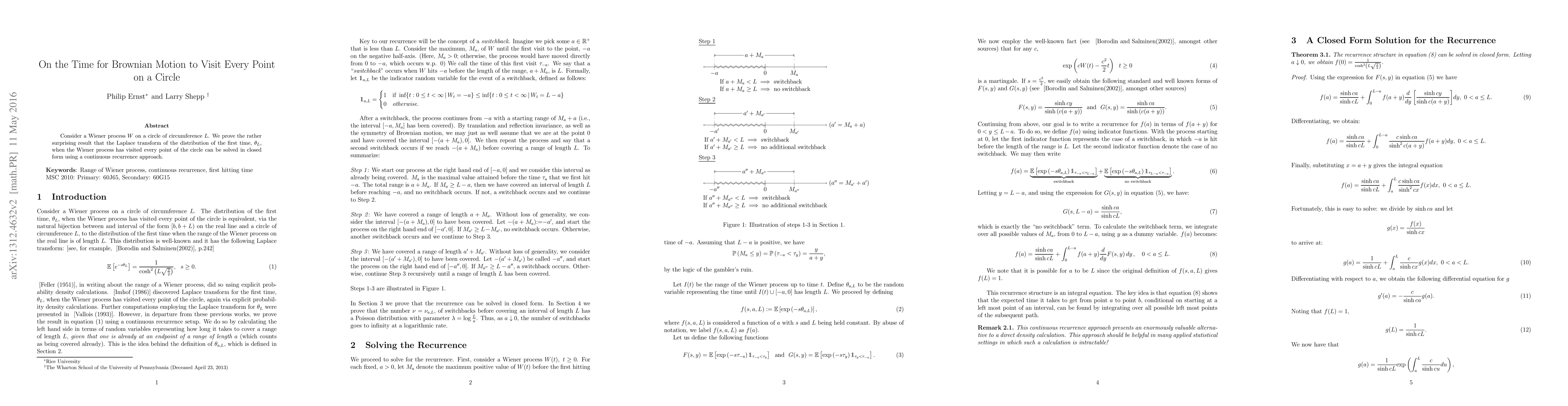 Consider a Wiener process $W$ on a circle of circumference $L$. We prove the rather surprising result that the Laplace transform of the distribution of the first time, $\theta_L$, when the Wiener process has visited every point of the circle can be solved in closed form using a continuous recurrence approach.