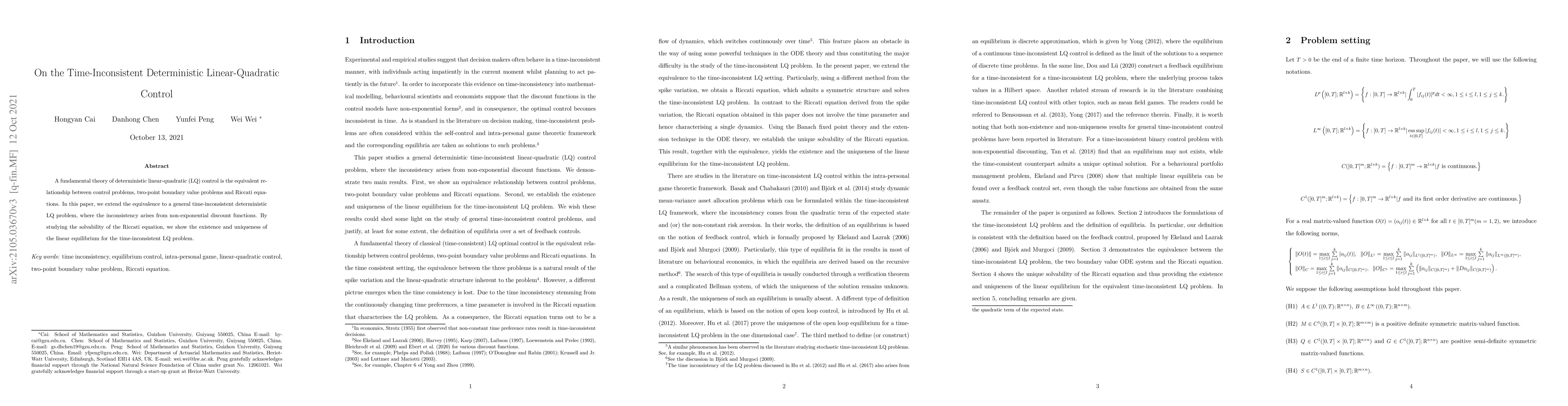 This paper extends the deterministic linear-quadratic control theory to time-inconsistent scenarios using non-exponential discount functions, demonstrating the existence and uniqueness of linear equilibrium through the solvability of the Riccati equation.