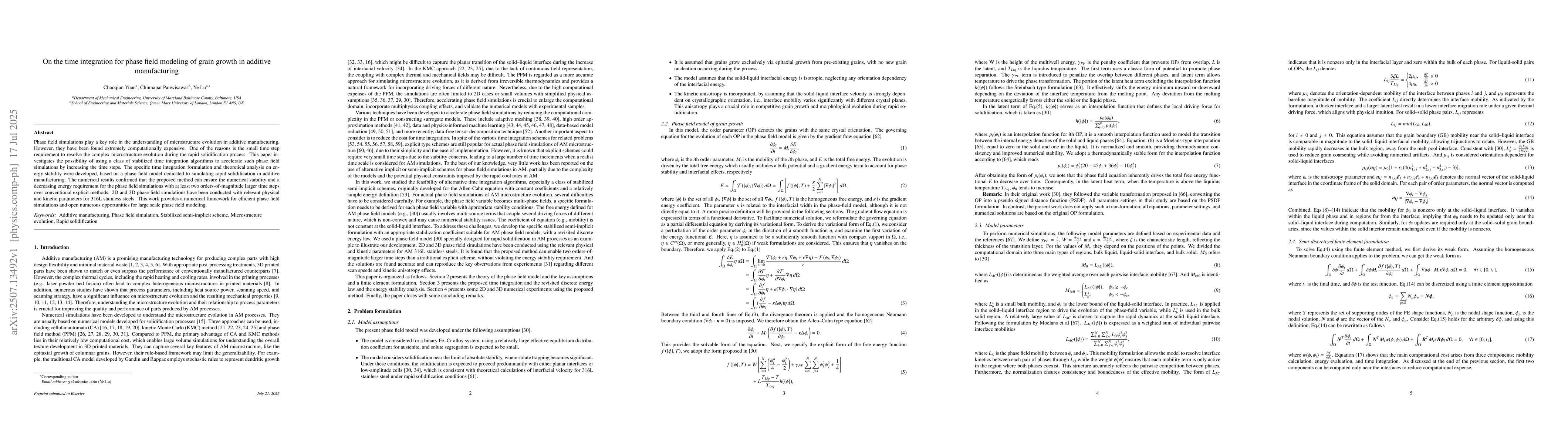 Phase field simulations play a key role in the understanding of microstructure evolution in additive manufacturing. However, they have been found extremely computationally expensive. One of the reasons is the small time step requirement to resolve the complex microstructure evolution during the rapid solidification process. This paper investigates the possibility of using a class of stabilized time integration algorithms to accelerate such phase field simulations by increasing the time steps. The specific time integration formulation and theoretical analysis on energy stability were developed, based on a phase field model dedicated to simulating rapid solidification in additive manufacturing. The numerical results confirmed that the proposed method can ensure the numerical stability and a decreasing energy requirement for the phase field simulations with at least two orders-of-magnitude larger time steps over conventional explicit methods. 2D and 3D phase field simulations have been conducted with relevant physical and kinetic parameters for 316L stainless steels. This work provides a numerical framework for efficient phase field simulations and open numerous opportunities for large scale phase field modeling.