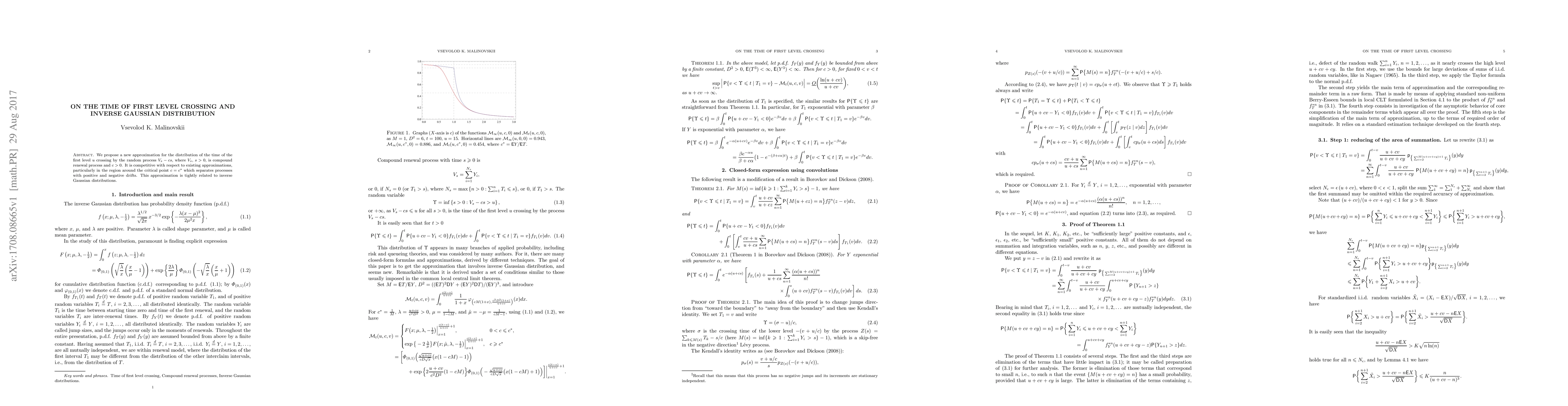 We propose a new approximation for the distribution of the time of the first level $u$ crossing by the random process $\homV{s}-cs$, where $\homV{s}$, $s>0$, is compound renewal process and $c>0$. It is competitive with respect to existing approximations, particularly in the region around the critical point $c=\cS$ which separates processes with positive and negative drifts. This approximation is tightly related to inverse Gaussian distributions.