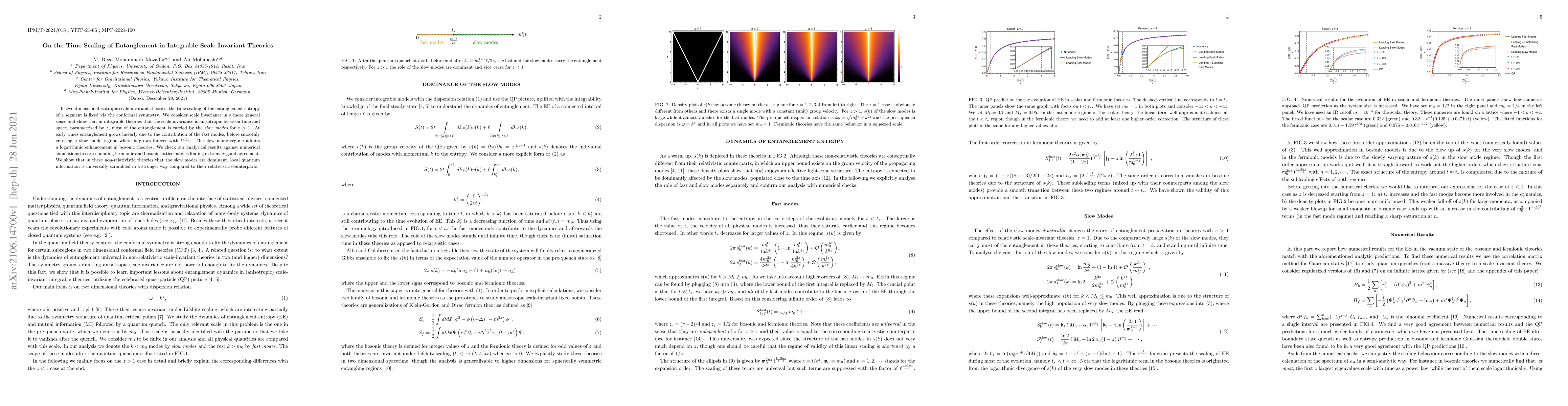 This paper explores the time scaling of entanglement entropy in two-dimensional integrable scale-invariant theories, demonstrating that entanglement grows linearly at early times due to fast modes before transitioning to a slower $t^{\frac{1}{1-z}}$ growth dominated by slow modes for $z>1$. Analytical results are validated by numerical simulations in fermionic and bosonic lattice models.
