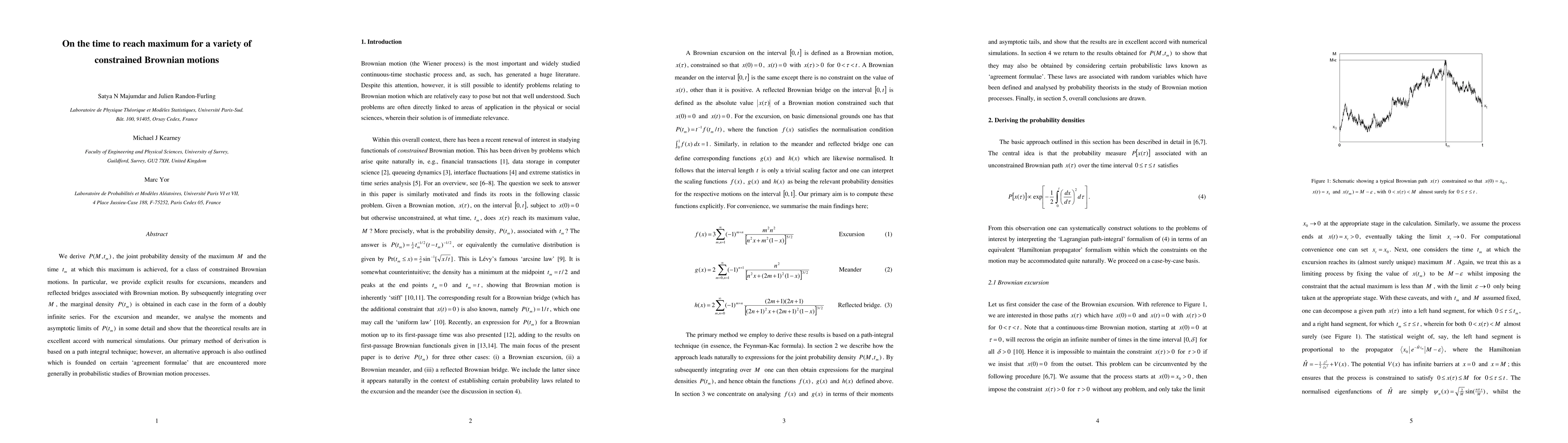 We derive P(M,t_m), the joint probability density of the maximum M and the time t_m at which this maximum is achieved for a class of constrained Brownian motions. In particular, we provide explicit results for excursions, meanders and reflected bridges associated with Brownian motion. By subsequently integrating over M, the marginal density P(t_m) is obtained in each case in the form of a doubly infinite series. For the excursion and meander, we analyse the moments and asymptotic limits of P(t_m) in some detail and show that the theoretical results are in excellent accord with numerical simulations. Our primary method of derivation is based on a path integral technique; however, an alternative approach is also outlined which is founded on certain "agreement formulae" that are encountered more generally in probabilistic studies of Brownian motion processes.