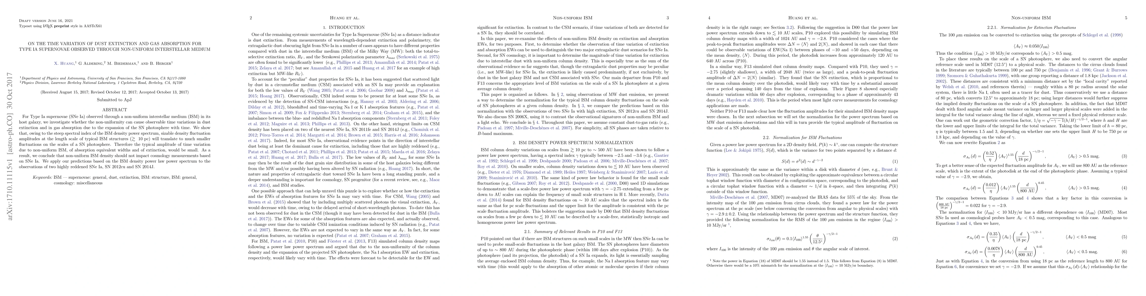 This paper investigates the impact of non-uniform interstellar medium (ISM) on the time variation of dust extinction and gas absorption in Type Ia supernovae (SNe Ia). It concludes that the typical amplitude of these variations due to ISM density fluctuations is small, thus not significantly affecting cosmology measurements based on SNe Ia.