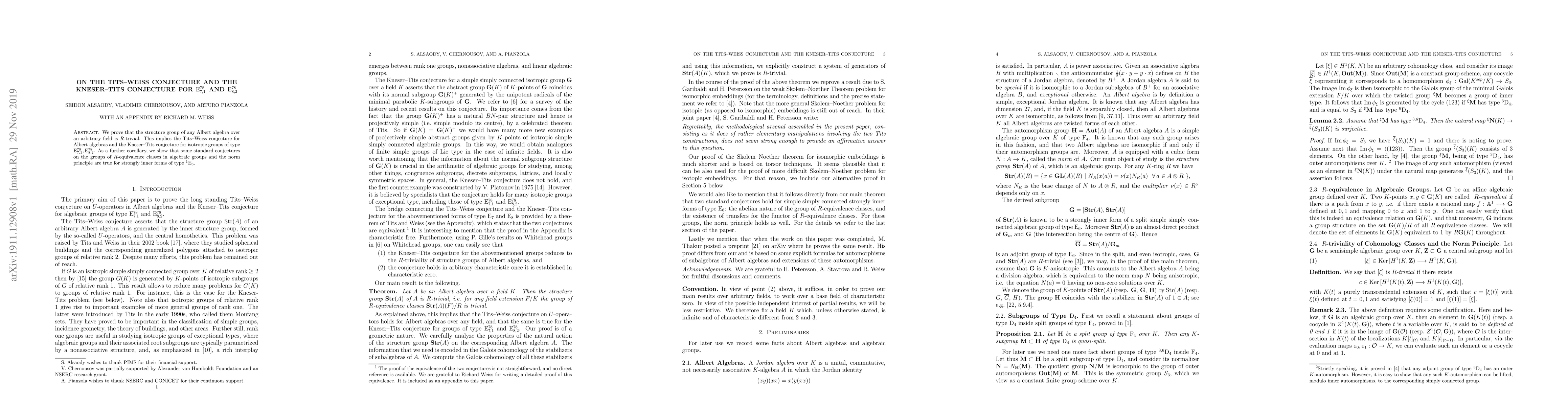 Summary: The paper proves the Tits-Weiss and Kneser-Tits conjectures for Albert algebras and certain isotropic groups, establishing that their structure groups are $R$-trivial. It also validates related conjectures for strongly inner forms of type $^1\mathrm{E}_6$.