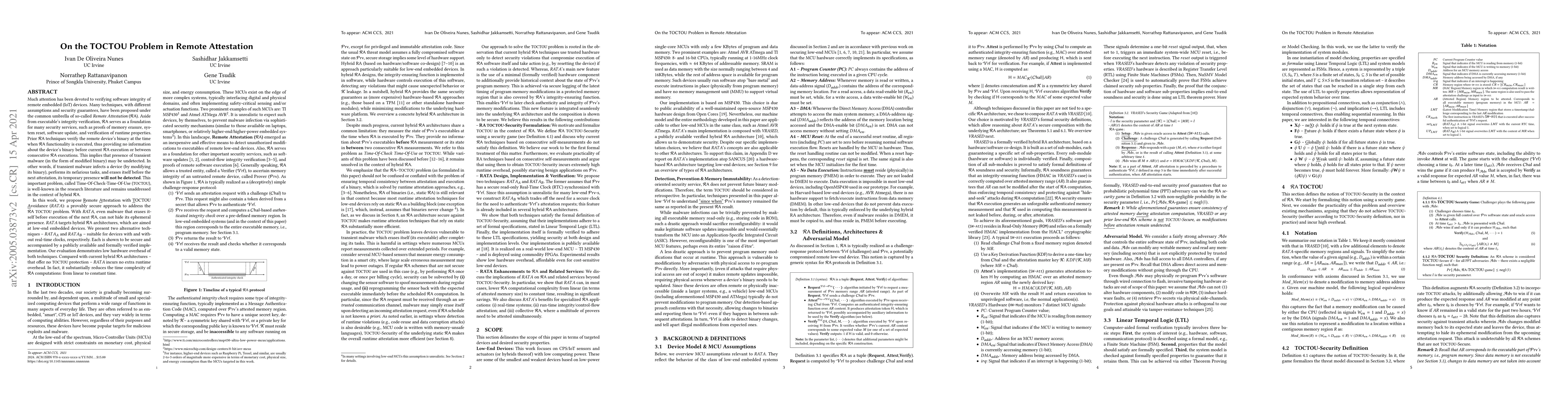 This paper introduces RATA, a secure method to tackle the TOCTOU problem in Remote Attestation, ensuring ephemeral presence detection even if malware erases itself. It presents two techniques, RATAa and RATAb, for devices with and without real-time clocks, respectively, both with low hardware overhead and no extra runtime cost.