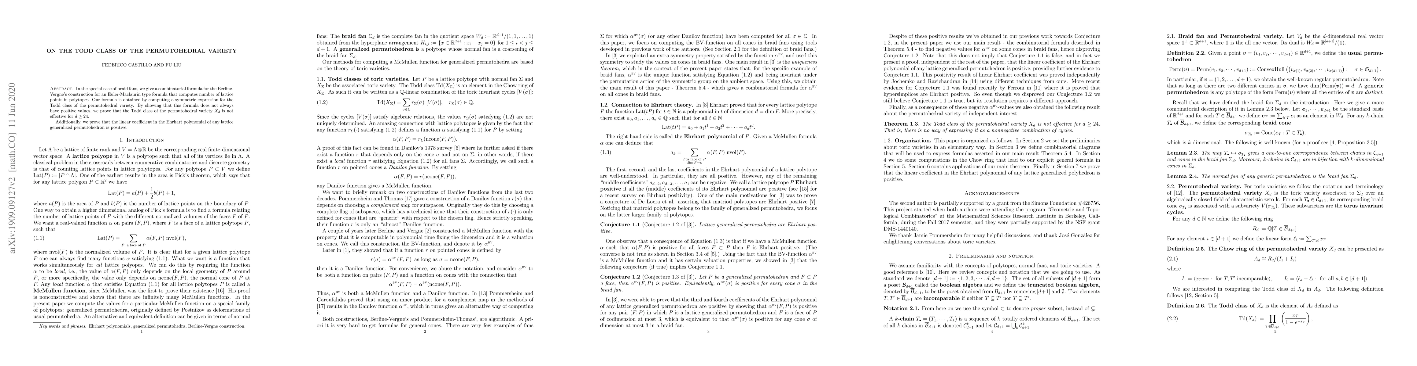 This paper presents a combinatorial formula for computing the Todd class of the permutohedral variety, revealing it is ineffective for dimensions $d \geq 24$. It also proves that the linear coefficient in the Ehrhart polynomial of any lattice generalized permutohedron is positive.