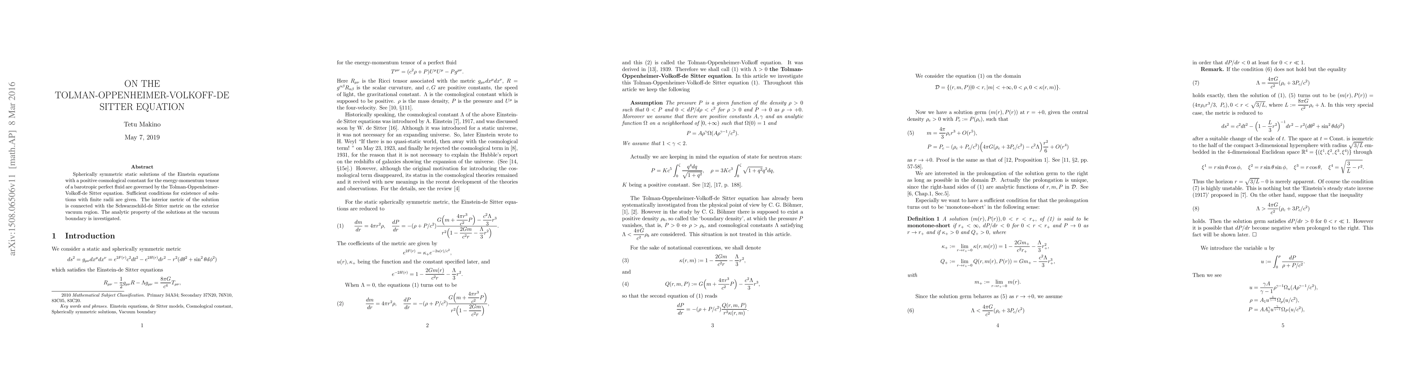 This paper investigates the existence and regularity of spherically symmetric static solutions to the Einstein equations with a positive cosmological constant, governed by the Tolman-Oppenheimer-Volkoff-de Sitter equation for a barotropic perfect fluid, and connects the interior metric with the Schwarzschild-de Sitter metric in the vacuum region.
