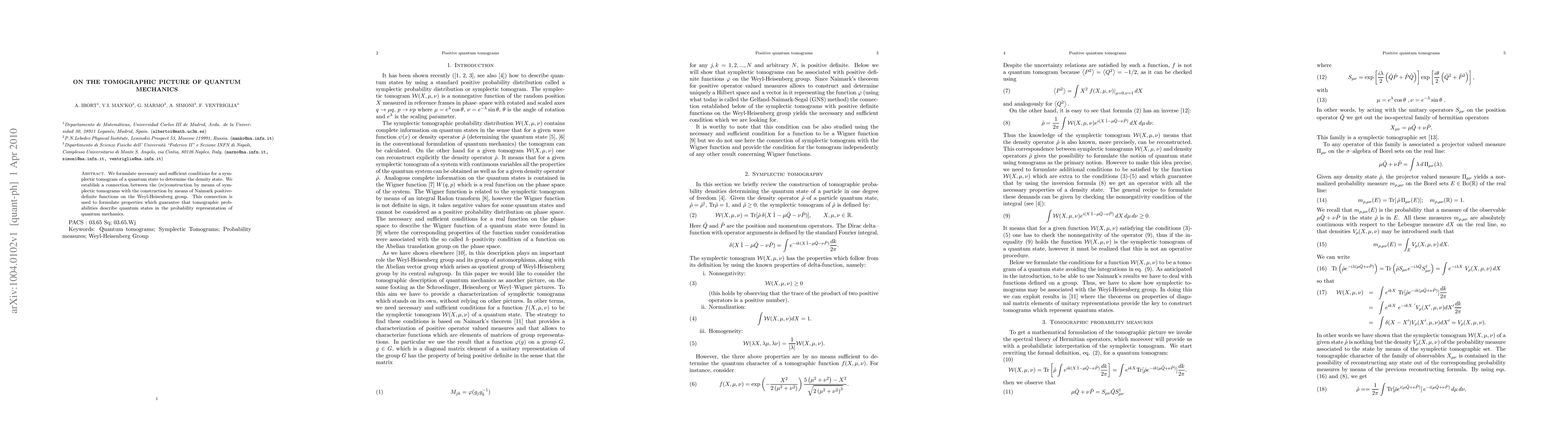 We formulate necessary and sufficient conditions for a symplectic tomogram of a quantum state to determine the density state. We establish a connection between the (re)construction by means of symplectic tomograms with the construction by means of Naimark positive-definite functions on the Weyl-Heisenberg group. This connection is used to formulate properties which guarantee that tomographic probabilities describe quantum states in the probability representation of quantum mechanics.