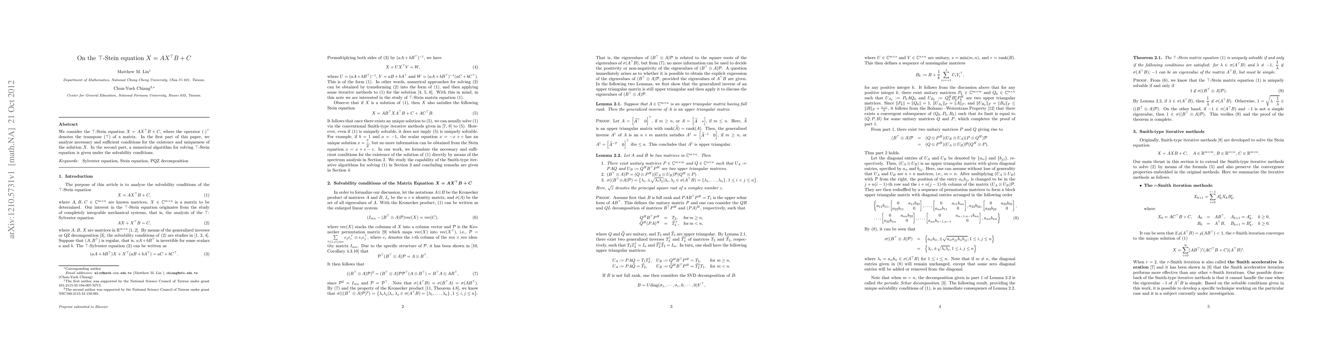 A study on the $ op$-Stein equation $X = AX^ op B + C$ provides conditions for its existence and uniqueness, as well as a numerical algorithm for solving it under solvability conditions.