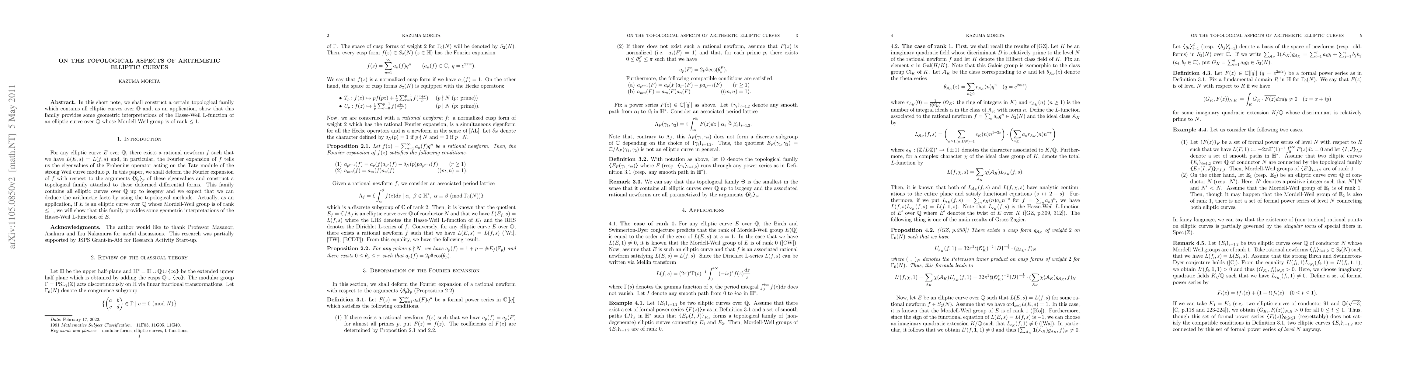 In this short note, we shall construct a certain topological family which contains all elliptic curves over Q and, as an application, show that this family provides some geometric interpretations of the Hasse-Weil L-function of an elliptic curve over Q whose Mordell-Weil group is of rank $\leq1$.