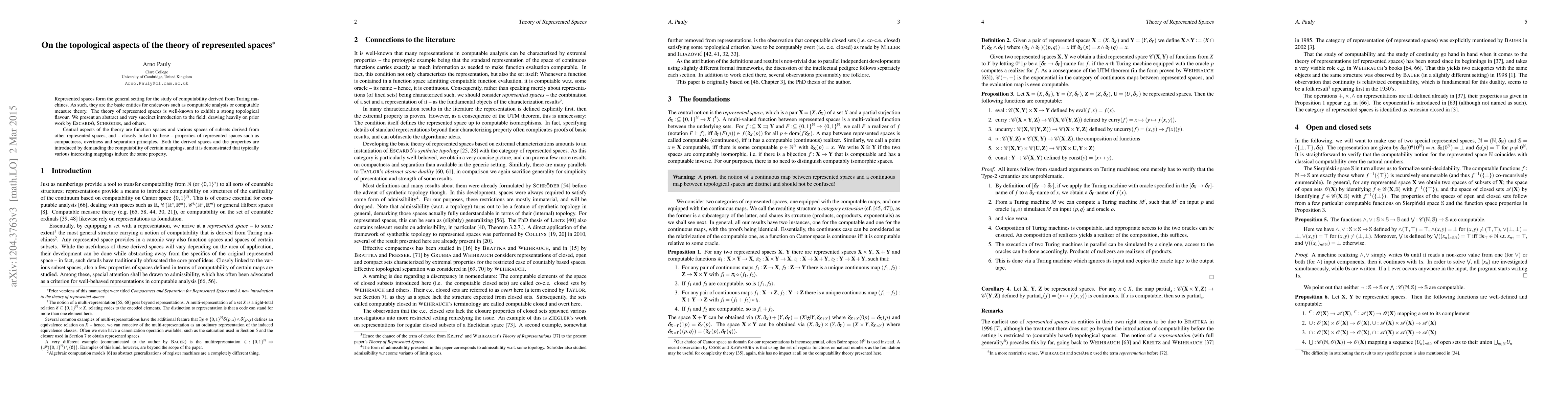 This paper provides a concise introduction to the topological aspects of represented spaces, focusing on computability derived from Turing machines. It explores function spaces, spaces of subsets, and properties like compactness, overtness, and separation principles, emphasizing the computability of mappings that define these properties.