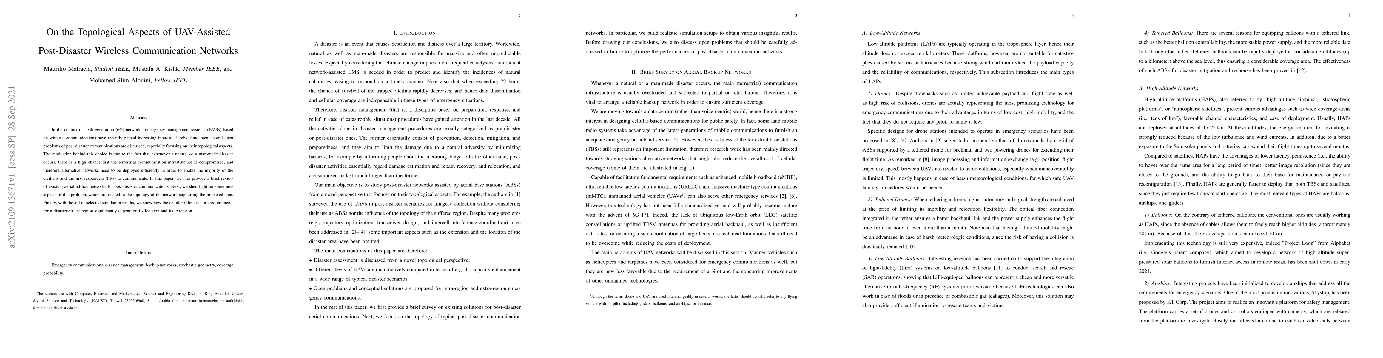 In the context of sixth-generation (6G) networks, emergency management systems (EMSs) based on wireless communications have recently gained increasing interest. Hereby, fundamentals and open problems of post-disaster communications are discussed, especially focusing on their topological aspects. The motivation behind this choice is due to the fact that, whenever a natural or a man-made disaster occurs, there is a high chance that the terrestrial communication infrastructure is compromised, and therefore alternative networks need to be deployed efficiently in order to enable the majority of the civilians and the first responders (FRs) to communicate. In this paper, we first provide a brief review of existing aerial ad-hoc networks for post-disaster communications. Next, we shed light on some new aspects of this problem, which are related to the topology of the network supporting the impacted area. Finally, with the aid of selected simulation results, we show how the cellular infrastructure requirements for a disaster-struck region significantly depend on its location and its extension.