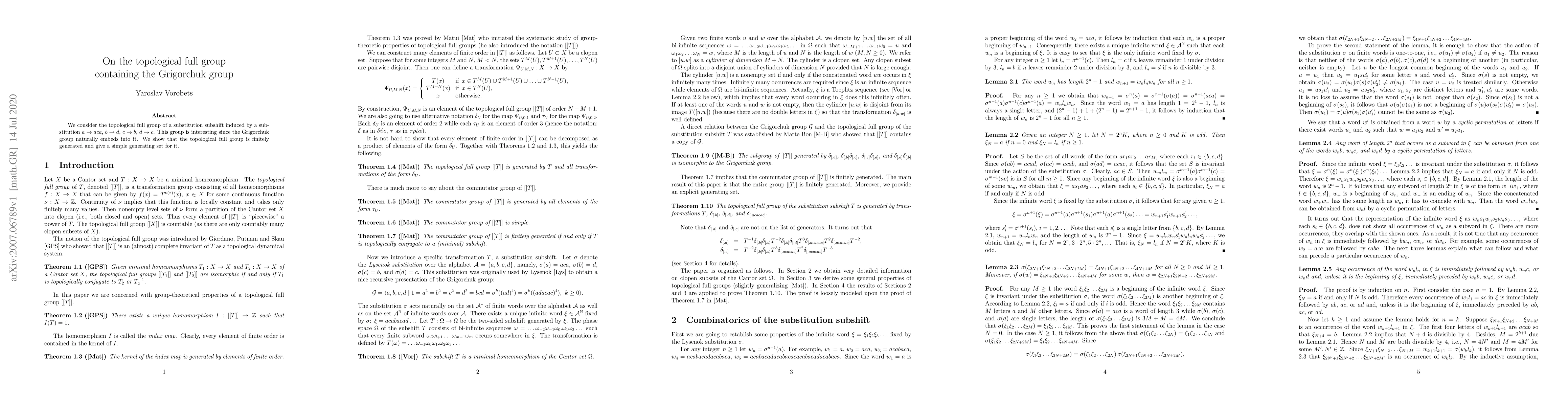 The paper investigates the topological full group of a substitution subshift defined by the substitution rules $a\to aca$, $b\to d$, $c\to b$, $d\to c$. It reveals that the Grigorchuk group embeds into this group and demonstrates that the topological full group is finitely generated, providing a straightforward generating set.