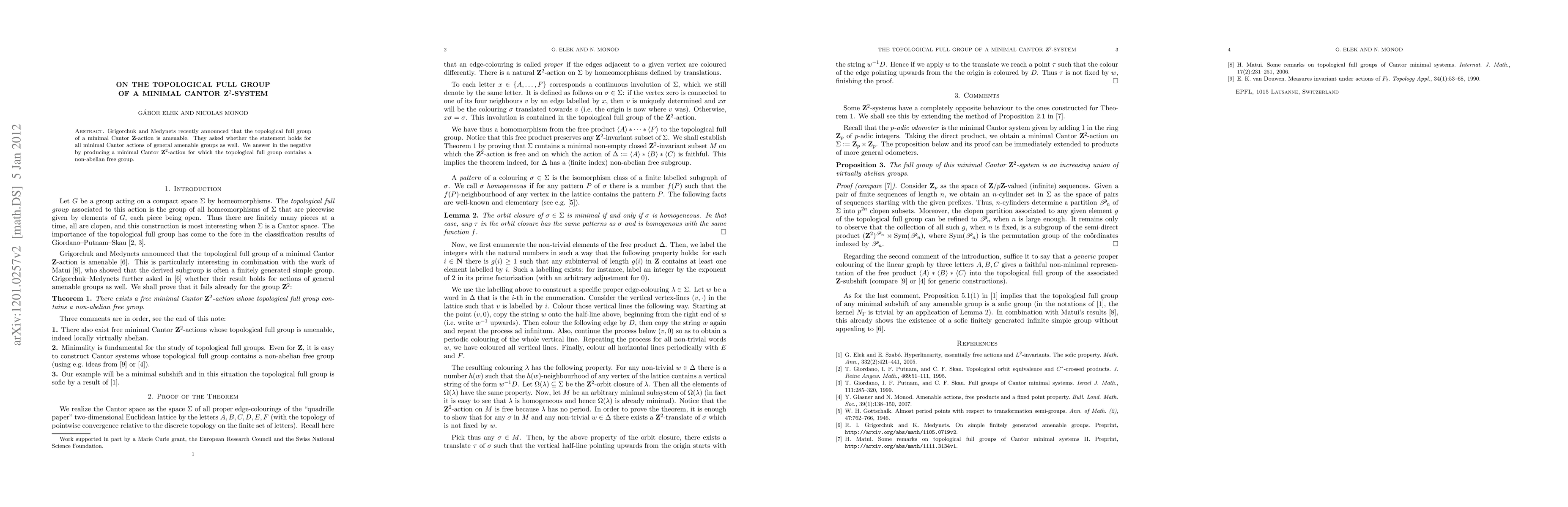 Grigorchuk and Medynets recently announced that the topological full group of a minimal Cantor Z-action is amenable. They asked whether the statement holds for all minimal Cantor actions of general amenable groups as well. We answer in the negative by producing a minimal Cantor Z^2-action for which the topological full group contains a non-abelian free group.