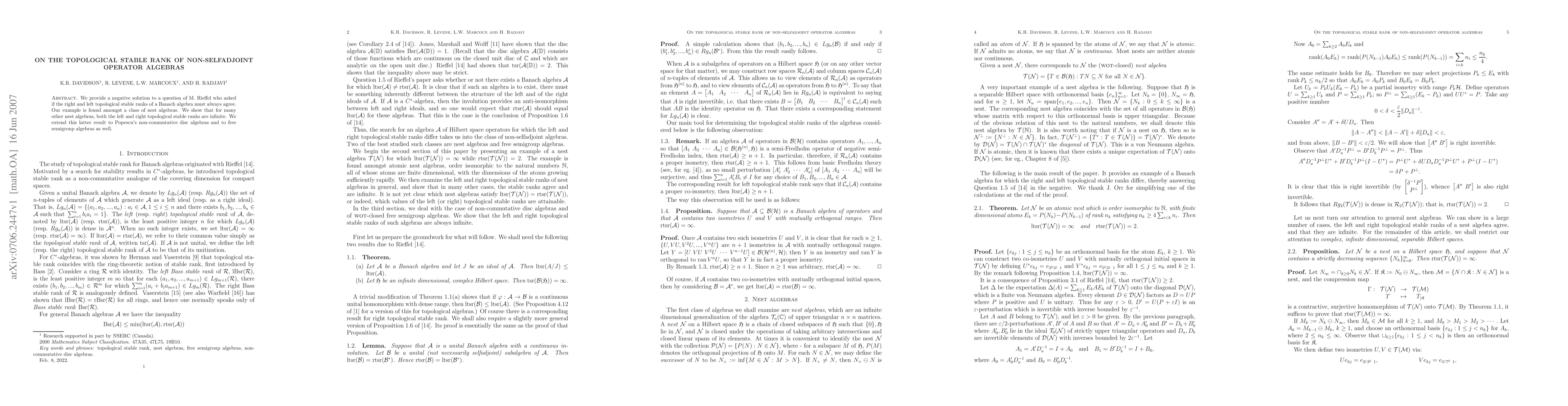 This paper disproves M. Rieffel's conjecture that the right and left topological stable ranks of a Banach algebra must always agree by presenting nest algebras where they differ. It also demonstrates that for many nest algebras, both ranks are infinite, extending this finding to Popescu's non-commutative disc algebras and free semigroup algebras.
