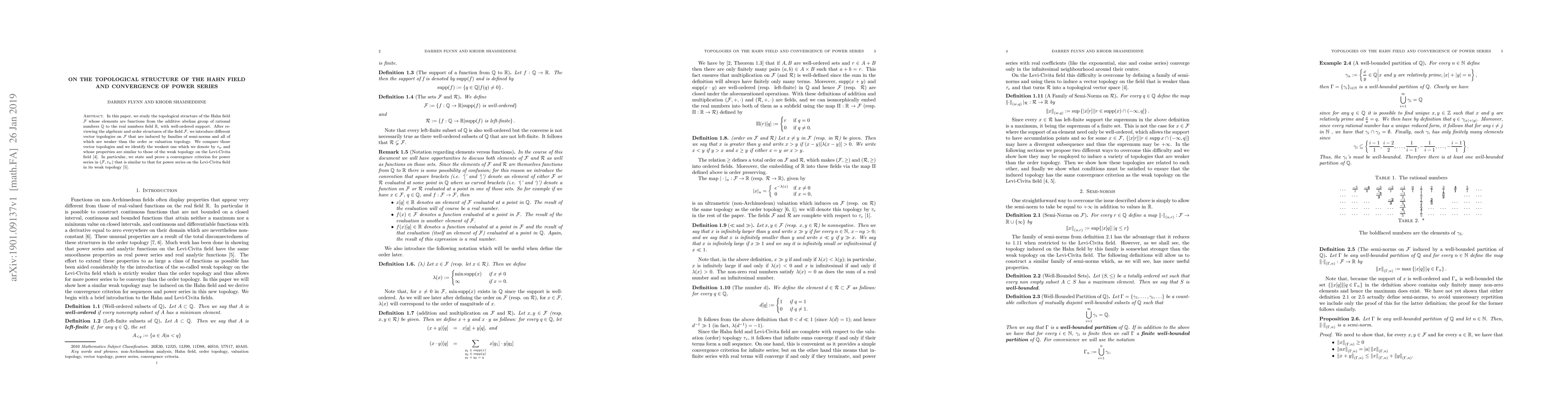 In this paper, we study the topological structure of the Hahn field whose elements are functions from the additive abelian group of rational numbers to the real numbers field, with well-ordered support. After reviewing the algebraic and order structures of the Hahn field, we introduce different vector topologies that are induced by families of semi-norms and all of which are weaker than the order or valuation topology. We compare those vector topologies and we identify the weakest one whose properties are similar to those of the weak topology on the Levi-Civita field. In particular, we state and prove a convergence criterion for power series that is similar to that for power series on the Levi-Civita field in its weak topology