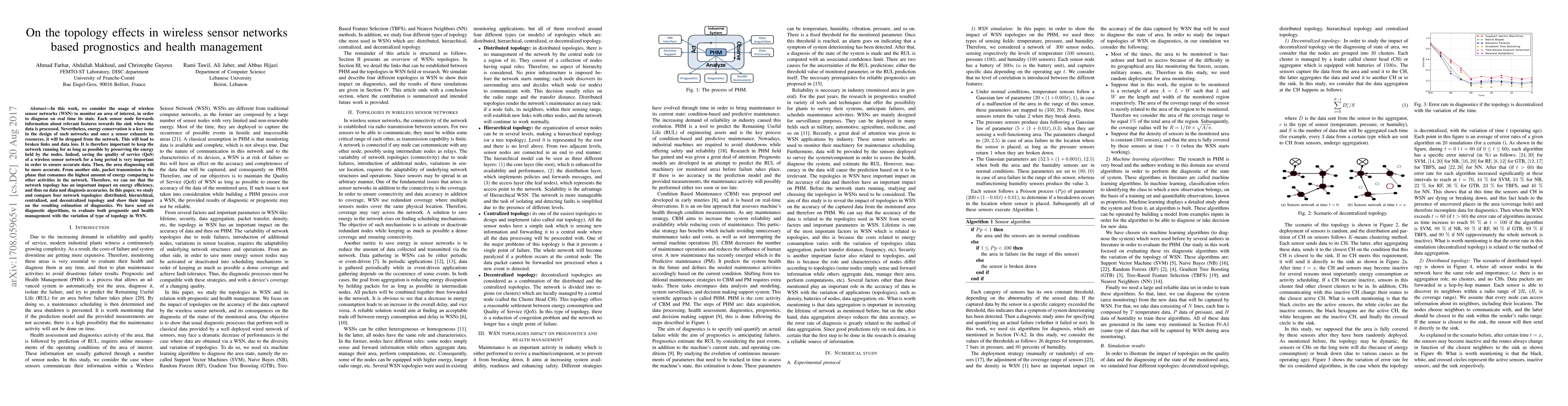 In this work, we consider the usage of wireless sensor networks (WSN) to monitor an area of interest, in order to diagnose on real time its state. Each sensor node forwards information about relevant features towards the sink where the data is processed. Nevertheless, energy conservation is a key issue in the design of such networks and once a sensor exhausts its resources, it will be dropped from the network. This will lead to broken links and data loss. It is therefore important to keep the network running for as long as possible by preserving the energy held by the nodes. Indeed, saving the quality of service (QoS) of a wireless sensor network for a long period is very important in order to ensure accurate data. Then, the area diagnosing will be more accurate. From another side, packet transmission is the phase that consumes the highest amount of energy comparing to other activities in the network. Therefore, we can see that the network topology has an important impact on energy efficiency, and thus on data and diagnosis accuracies. In this paper, we study and compare four network topologies: distributed, hierarchical, centralized, and decentralized topology and show their impact on the resulting estimation of diagnostics. We have used six diagnostic algorithms, to evaluate both prognostic and health management with the variation of type of topology in WSN.