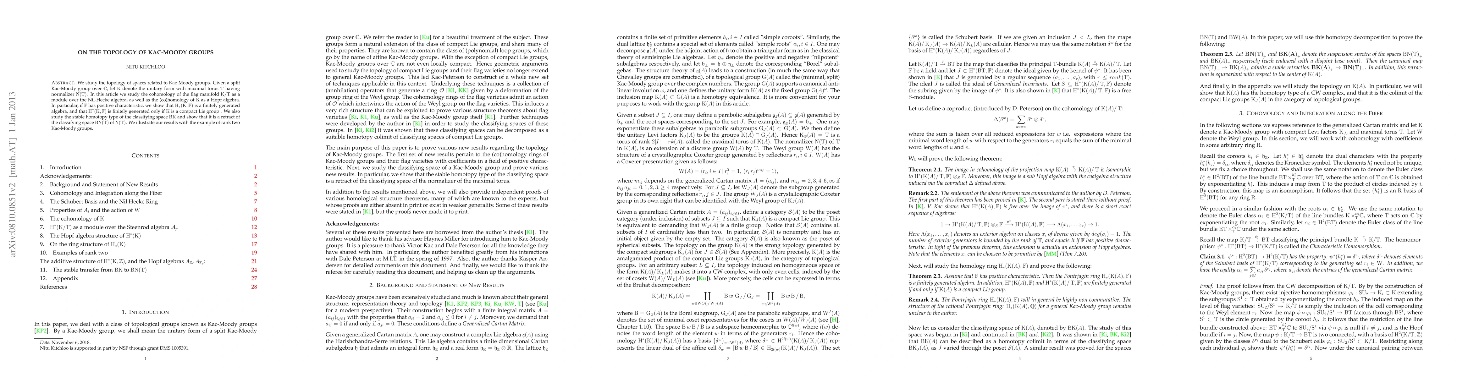 This paper explores the topology of spaces associated with Kac-Moody groups, focusing on the cohomology of the flag manifold K/T and the Hopf algebra structure of K. It demonstrates that the cohomology of K in positive characteristic fields is finitely generated, and that stable homotopy type of the classifying space BK is a retract of BN(T).
